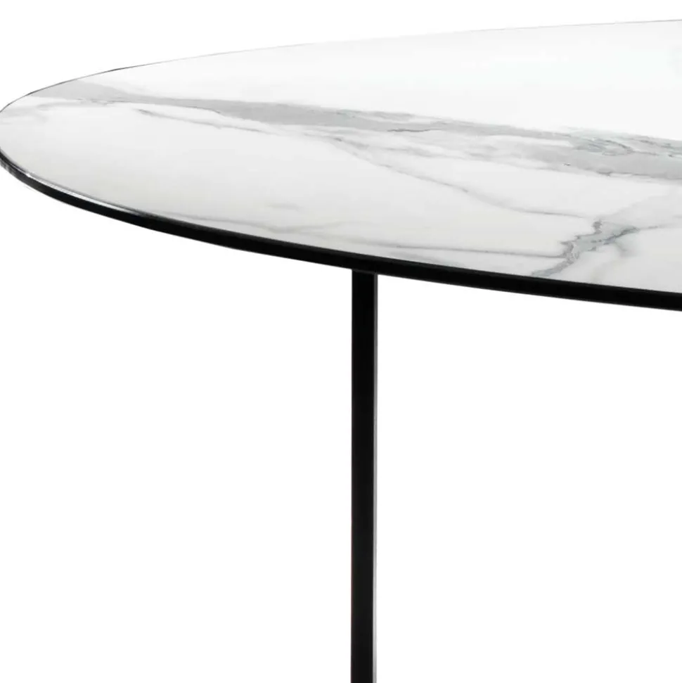 Umrahmt wird diese elegante Platte von einem feinen, schwarzen Metallrahmen, der das Design stilvoll abrundet und dem Tisch eine klare Kontur verleiht. Der Kontrast zwischen der hellen Marmoroptik und dem dunklen Rahmen bringt visuelle Tiefe in Ihren Wohnraum und lässt den Tisch sowohl in hellen als auch in dunkleren Interieurs erstrahlen.