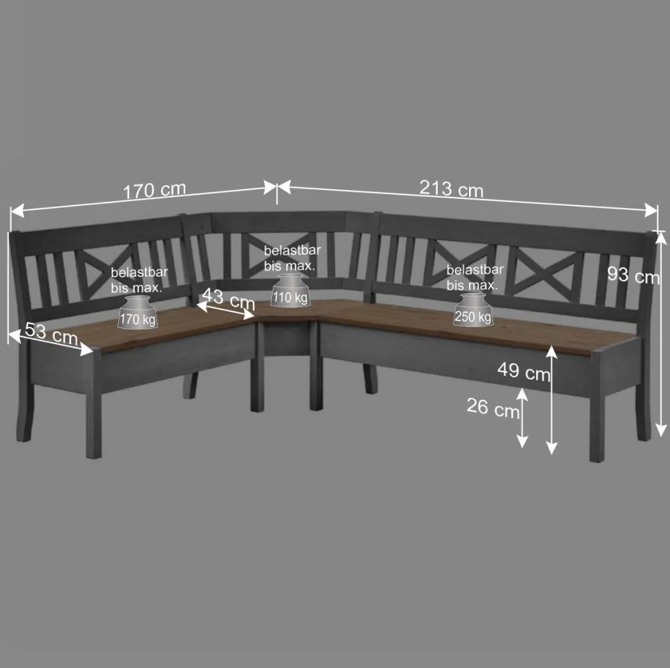 Die platzsparende Winkelform mit den Maßen 213 x 170 cm macht die Jytte-Eckbank zur perfekten Lösung für kleine wie große Räume. Dank der cleveren Bauweise kann sie auch spiegelverkehrt montiert werden – maximale Flexibilität, ganz nach Ihren Raumverhältnissen. Die komfortable Rückenlehne mit dekorativen Kreuzelementen und vertikalen Streben schafft optische Leichtigkeit und unterstreicht den rustikalen Charme.