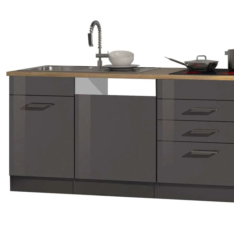 Klare Linien, kontrastreiche Farbkombinationen und eine stimmige Materialauswahl verleihen dieser Küchenzeile ihren unverwechselbaren Charakter. Fronten in edlem Grau Hochglanz bringen Glanz und Eleganz in den Raum und reflektieren auf harmonische Weise das Licht – so wirkt die Küche offen und großzügig. Der Korpus in neutralem Grau unterstreicht die moderne Formensprache, während die melaminbeschichtete Arbeitsplatte in naturgetreuer Sonoma Eiche eine wohnliche Wärme ausstrahlt.