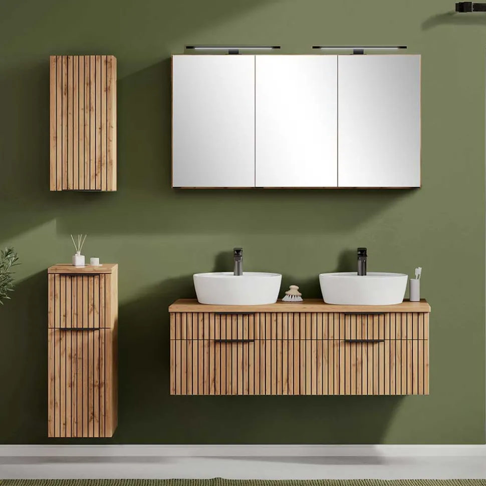 Modernes Design bedeutet hier mehr als nur klare Linien: Es ist die harmonische Verbindung aus Form, Funktion und Materialien, die diesen Waschplatz so besonders macht. Die Kombination aus der natürlichen Wildeiche-Optik, mattschwarzen Akzenten und fein strukturierten Fronten in Rillenoptik verleiht dem Set einen markanten, zeitgemäßen Look. Die melaminbeschichteten Oberflächen in Holzoptik sind nicht nur optisch ein Highlight, sondern auch besonders pflegeleicht und widerstandsfähig – ideal für den täglichen Einsatz.