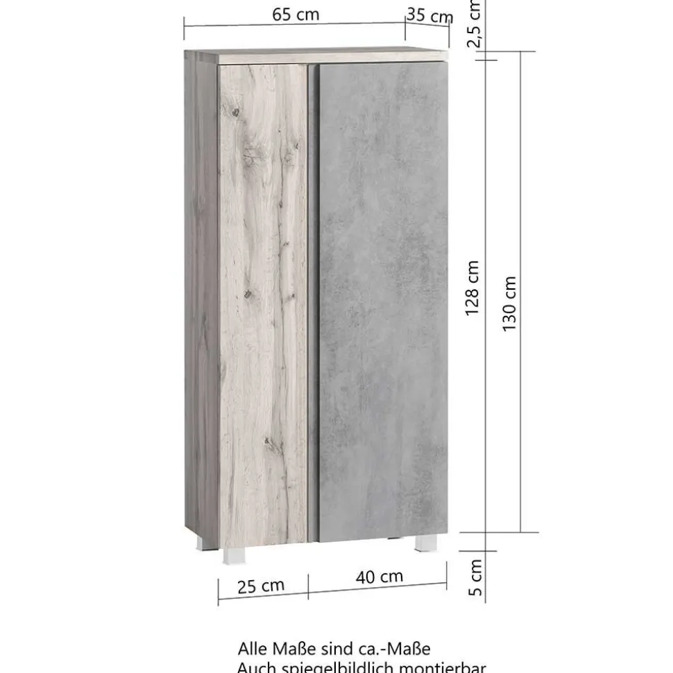 - Korpus und seitliche Türen mit Melaminbeschichtung in Holzoptik, Fronten tiefgezogen in Betongrau foliert