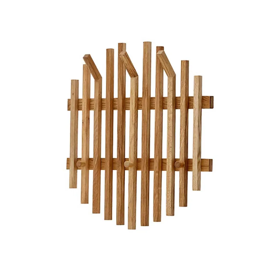 Die „Gangizo“ Hänge-Garderobe besteht aus elf vertikalen Eichenholzleisten, die auf zwei horizontalen, breiteren Leisten befestigt sind. Diese vertikalen Leisten variieren in ihrer Länge und sind so angeordnet, dass eine annähernd runde Silhouette entsteht. Sechs robuste Kleiderhaken bieten ausreichend Platz für Jacken, Mäntel und Accessoires. Drei Haken sind in abgewinkelter Form im oberen Bereich platziert, während drei runde Knopfhaken weiter unten auf unterschiedlichen Leisten angebracht sind. Jeder Haken ist bis zu 2 kg belastbar, was diese Garderobe zu einem praktischen und stilvollen Ordnungshelfer macht.