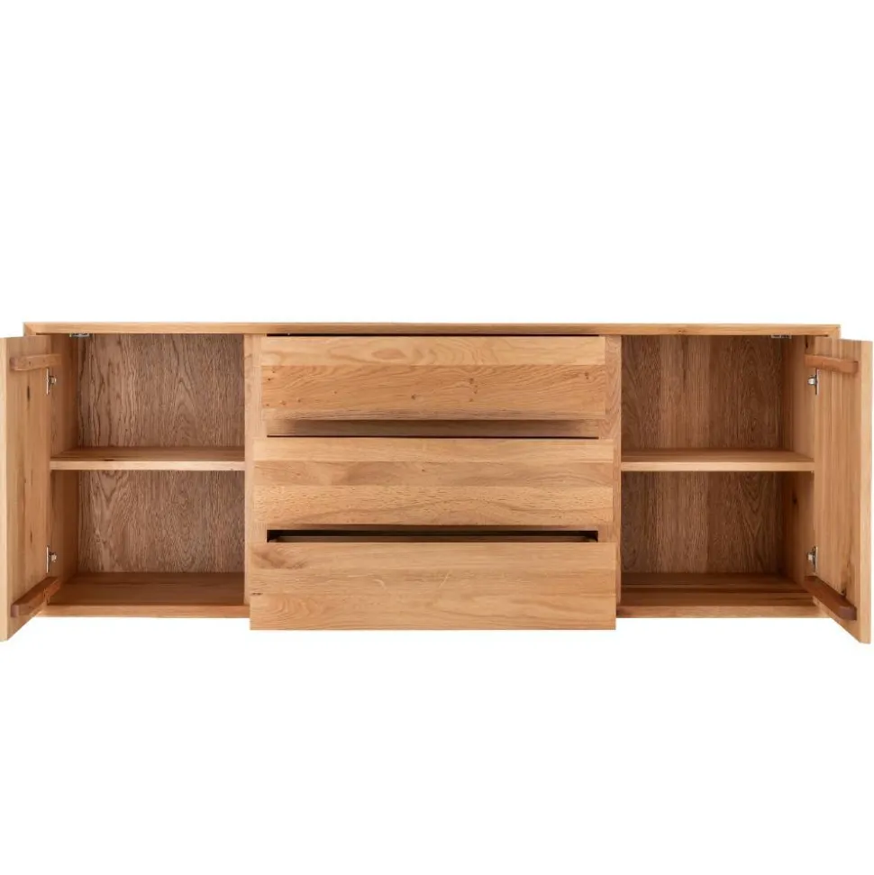 Links und rechts befinden sich jeweils eine Drehtür mit gedämpften Metallscharnieren. Dahinter sorgen Einlegeböden für eine praktische Zweiteilung – ideal für Geschirr, Dokumente oder Alltagsgegenstände. In der Mitte bieten drei Schubladen mit Soft-Close-Metallauszügen komfortablen Stauraum für alles, was schnell griffbereit sein soll. Die Fronten sind mit einer vertikalen Rillenstruktur versehen und verzichten bewusst auf sichtbare Griffe – unauffällig integrierte Griffmulden sorgen für ein dezentes und bequemes Handling.