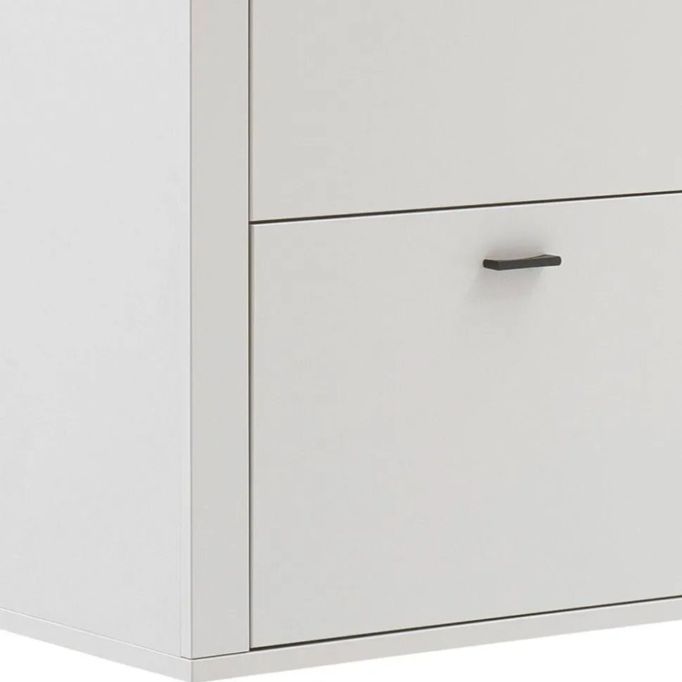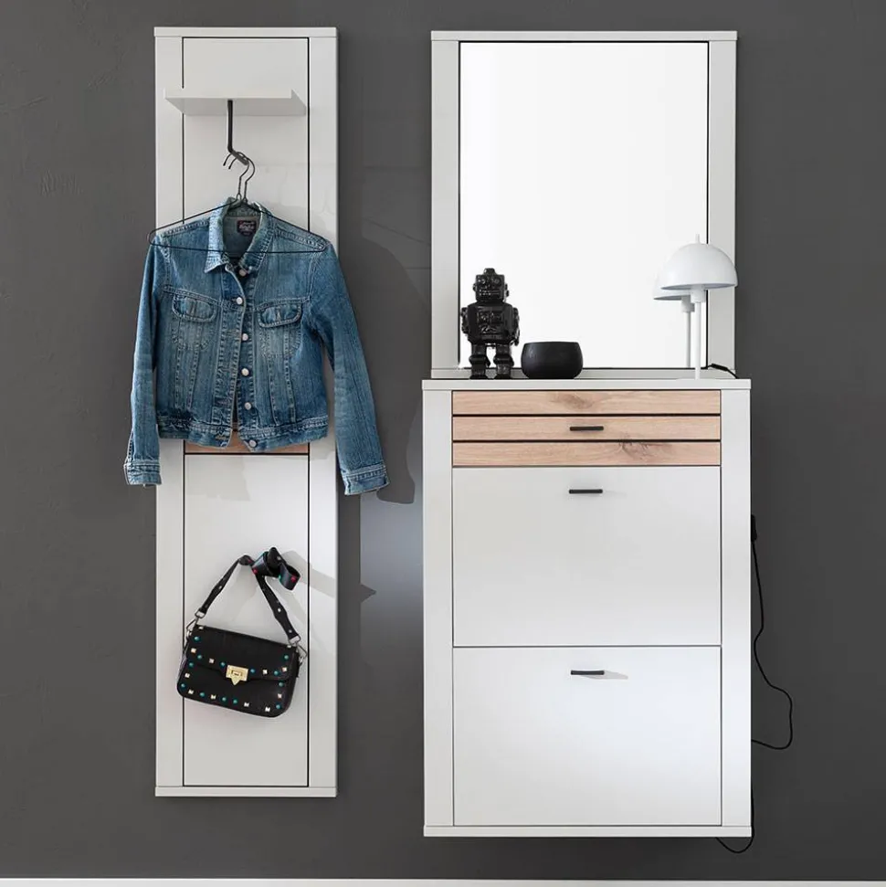 Die schmale Garderobe bietet durch zwei stabile Metall-Kleiderhaken und eine Hutablage mit Metall-Kleiderstange praktischen Stauraum für Jacken und Accessoires. Der Schuhkipper ermöglicht eine geordnete Aufbewahrung von Schuhen durch zwei gedämpfte Schuhklappen mit integrierten Doppel-Metallschuhkörben. Der 73 cm breite Spiegel ergänzt das Set durch seine großzügige Reflexionsfläche und vergrößert optisch den Raum.