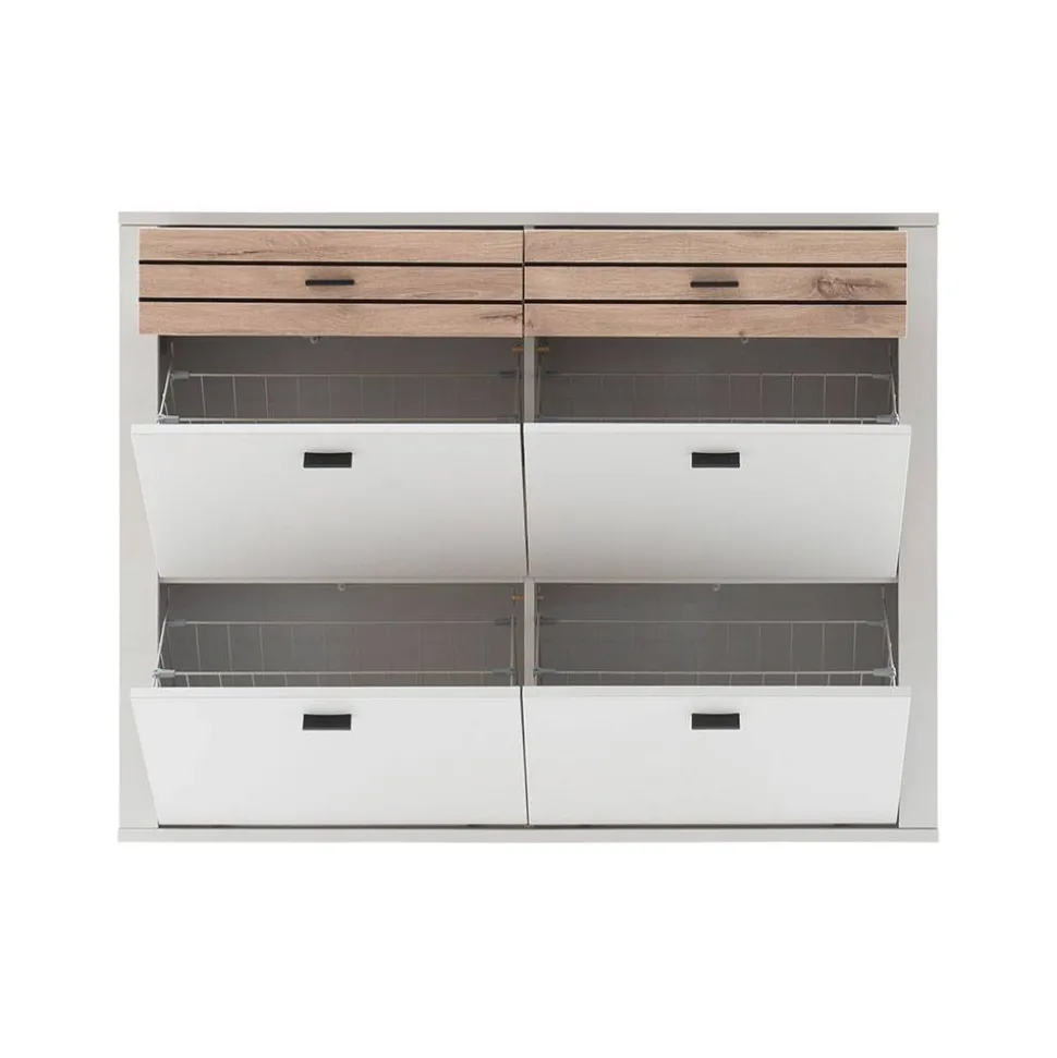 Im oberen Bereich bieten zwei leichtgängige Schubladen mit Metallauszug, Unterflurführung und Soft-Close-Funktion praktischen Platz für kleinere Accessoires. Darunter befinden sich vier Schuhklappen mit gedämpften Metallbeschlägen, die jeweils einen Doppel-Metallschuhkorb beherbergen – ideal für die platzsparende Aufbewahrung von bis zu 16 Paar Schuhen bis Größe 39.