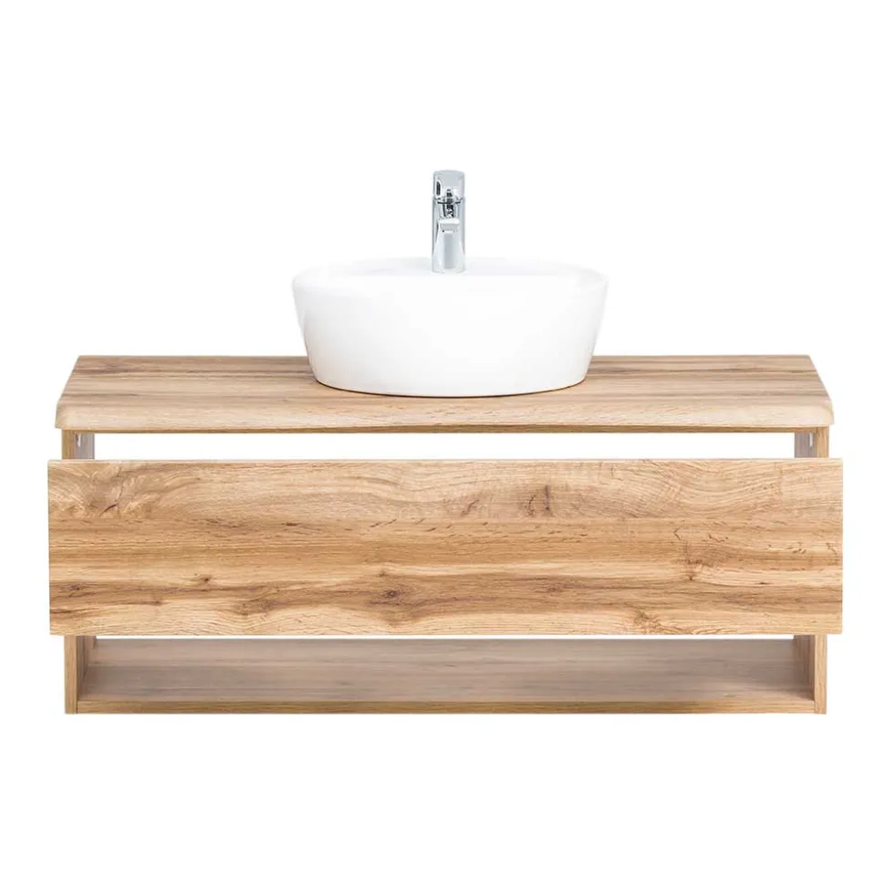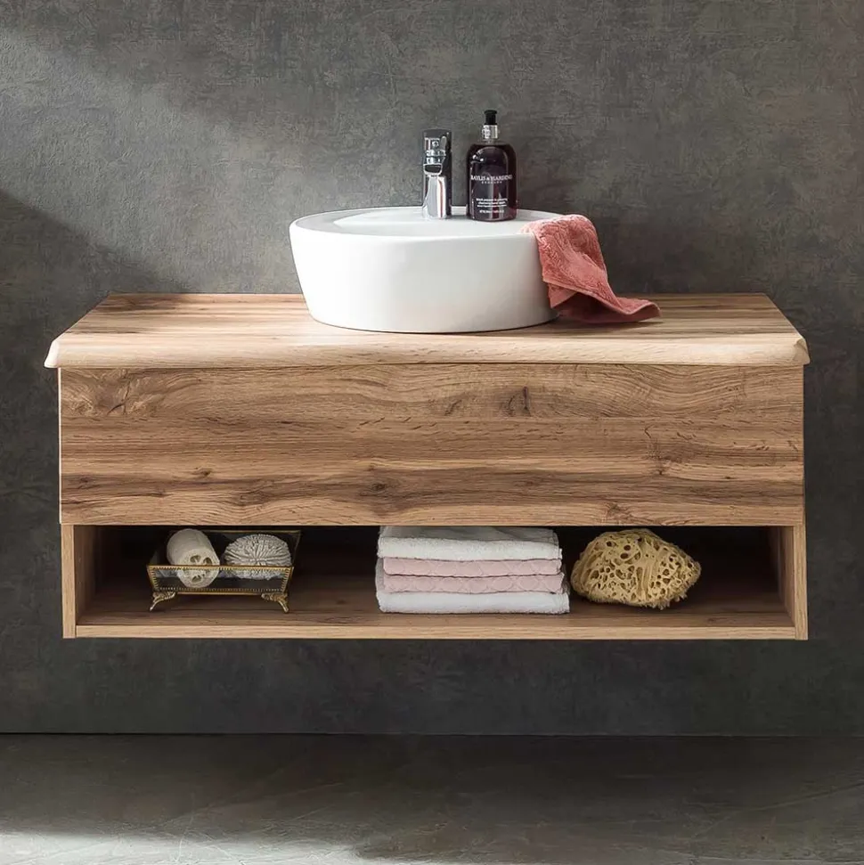 Lassen Sie Ihre Vorstellungen von einem Badezimmer mit natürlichem Charme und modernem Komfort einfach Wirklichkeit werden. Der hängende Waschtisch Tofias ist ideal für ein zeitgemäßes Landhaus-Ambiente im Bad geeignet. Mit seiner reizvollen Holzoptik in Wildeiche und der nachgebildeten Naturkante als Eyecatcher verleiht er Ihrem Badezimmer eine besondere Note.