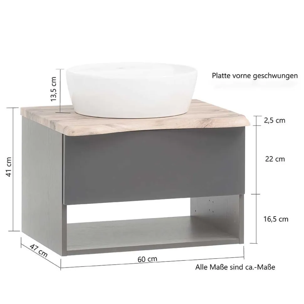 Im Lieferumfang des hängenden Waschtisches Tofias ist ein rundes Aufsatz-Waschbecken enthalten. Es hat einen Durchmesser von etwa 42 cm und eine Höhe von 13,5 cm. Bitte beachten Sie, dass die Armatur nicht im Lieferumfang enthalten ist. Für einen unkomplizierten Anschluss steht Ihnen ein vorgefertigter Ausschnitt für den Siphon mit den Maßen von etwa 8,1×19,5 cm zur Verfügung.