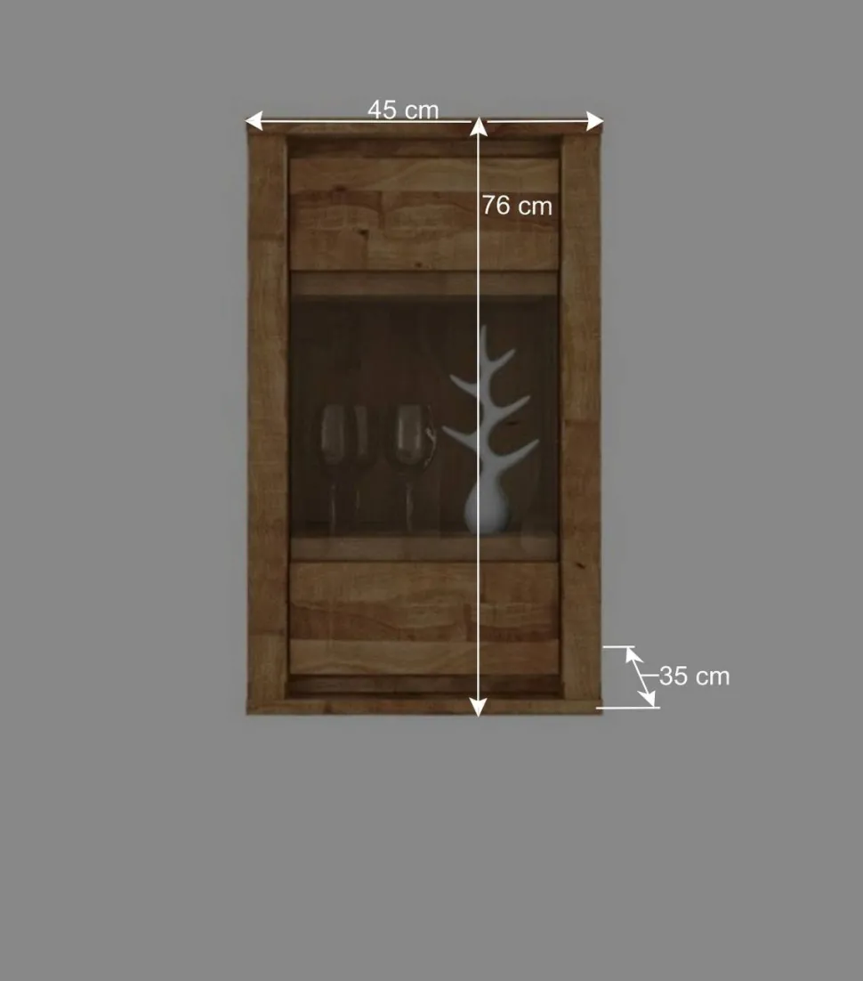 Mit einer Materialstärke von 2,5 cm für die Deckplatte und 2 cm für die Seiten, steht die Hängevitrine „Nadalia“ für beste Qualität und Verarbeitung. Die Maße von 45 cm Breite, 76 cm Höhe und 35 cm Tiefe bieten viel Stauraum für Ihre Lieblingsstücke. Die Vitrine verfügt über eine Glastür mit geräuscharmer Dämpfung und zwei Holzböden dahinter, ideal für die stilvolle Präsentation Ihrer Deko-Objekte. Das Öffnen der Tür ist durch die Griffmulden, welche eine grifflose Optik erzeugen, ein Leichtes.