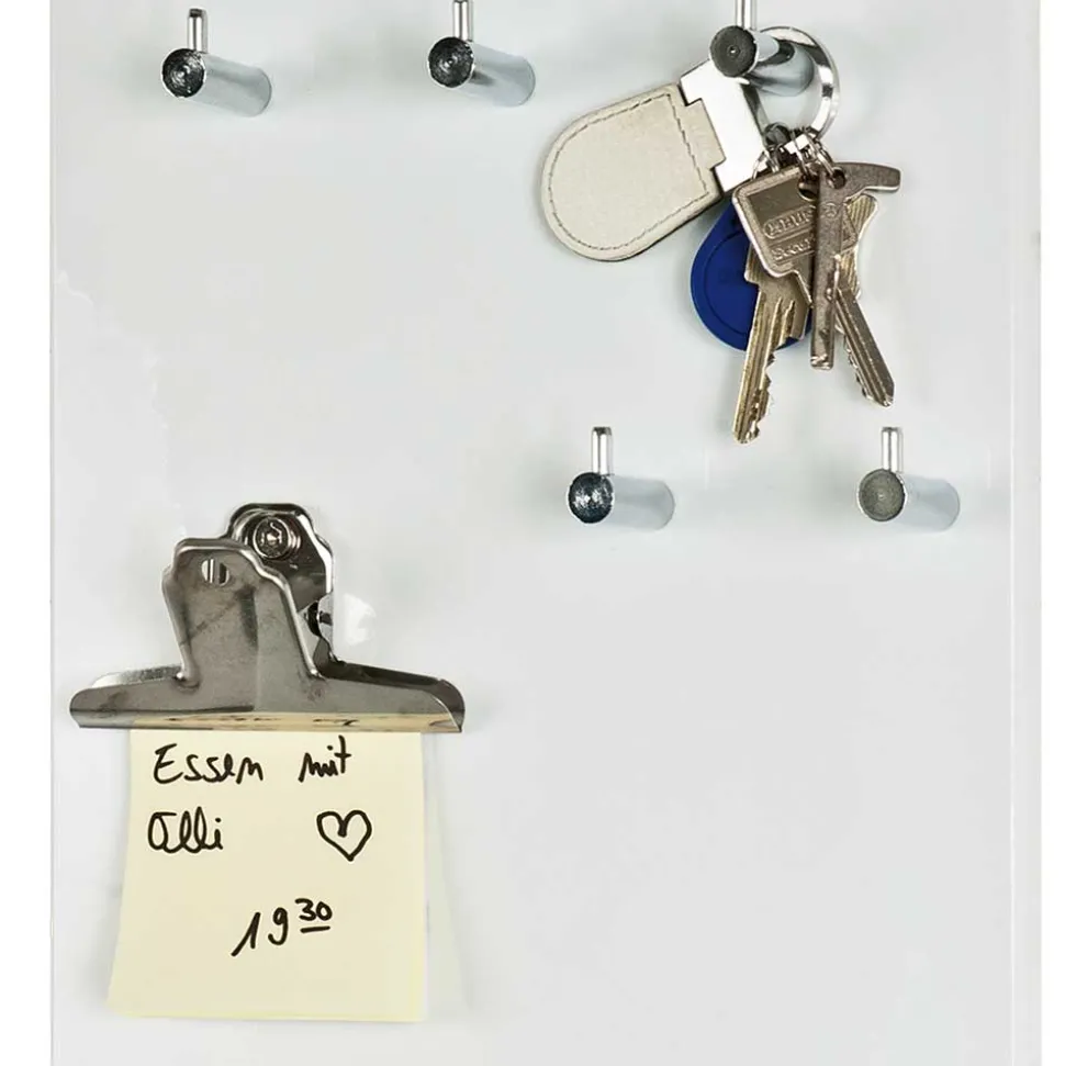 - Sieben Haken aus Metall und eine Klemme bieten Platz für Schlüssel und Notizen