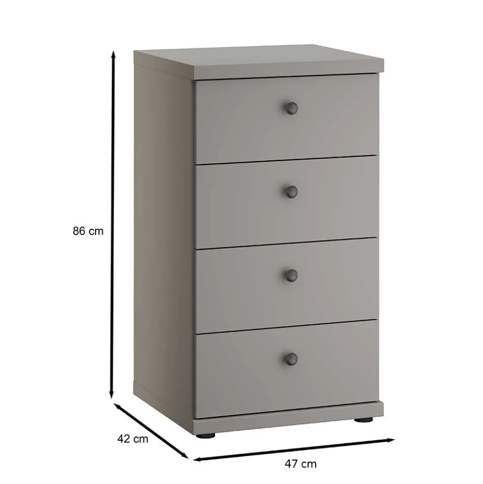 Mit einer Breite von 47 cm, einer Höhe von 86 cm und einer Tiefe von 42 cm, bietet „Ridonna“ reichlich Stauraum, um alle Ihre Schätze unterzubringen. Die vier Schubladen, ausgestattet mit einem hochwertigen Metallauszug, gewährleisten eine sanfte und langlebige Handhabung. Das besondere Highlight sind die dezenten Knopfgriffe in Altsilberfarben, die das Design perfekt abrunden.