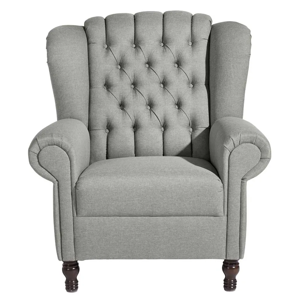 - Stilsicherer Sessel in Hellgrau und Nussbaumfarben