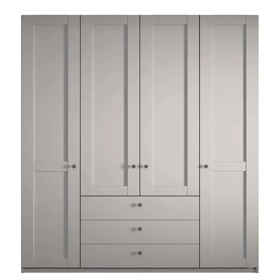 Innerhalb des Schrankes bieten drei Fachelemente – in den Breiten von 47,5/96,4/47,5 cm – jeweils ausgestattet mit zwei Einlegeböden und einer Kleiderstange, genügend Platz für Ihre Garderobe. Für Kleinigkeiten oder Wäsche stehen zudem drei Schubladen mit robustem Metallauszug bereit. Diese lassen sich leicht herausziehen und schließen. Abgerundet wird das stimmige Design durch runde Metall-Knopfgriffe in Altsilberfarben.
