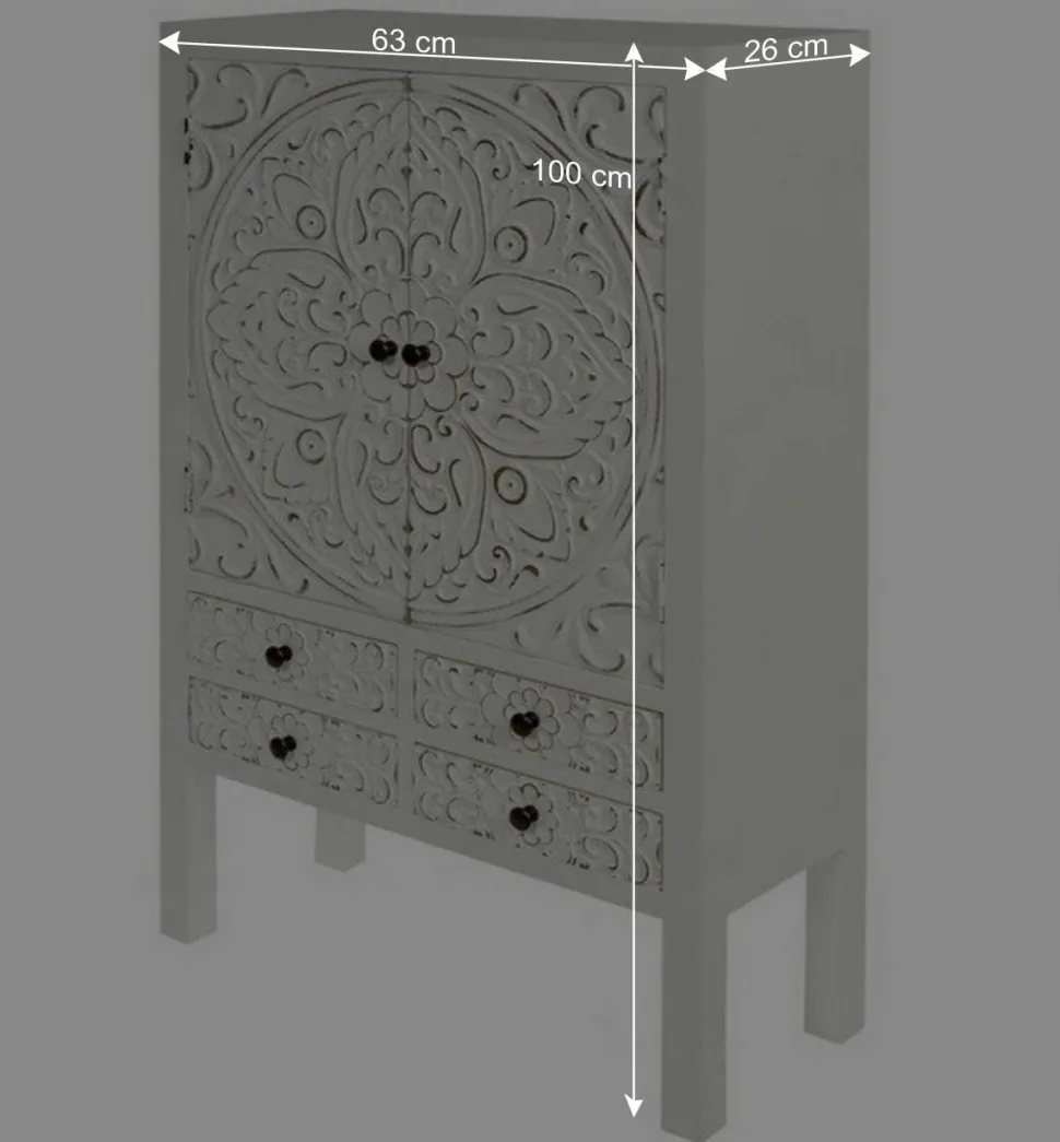 Acacio überzeugt nicht nur optisch, sondern auch funktional. Mit einer Breite von 63 cm, einer Höhe von 100 cm und einer Tiefe von lediglich 26 cm passt es selbst in kleinere Räume, ohne auf Stauraum zu verzichten. Im unteren Bereich finden sich vier praktische Schubladen, ideal für kleinere Gegenstände wie Schlüssel, Accessoires oder Dokumente. Hinter den zwei kunstvoll verzierten Türen mit altmessingfarbenen Metallknöpfen verbergen sich zwei Einlegeböden, die zusätzlichen Platz für Bücher, Geschirr oder dekorative Elemente bieten.