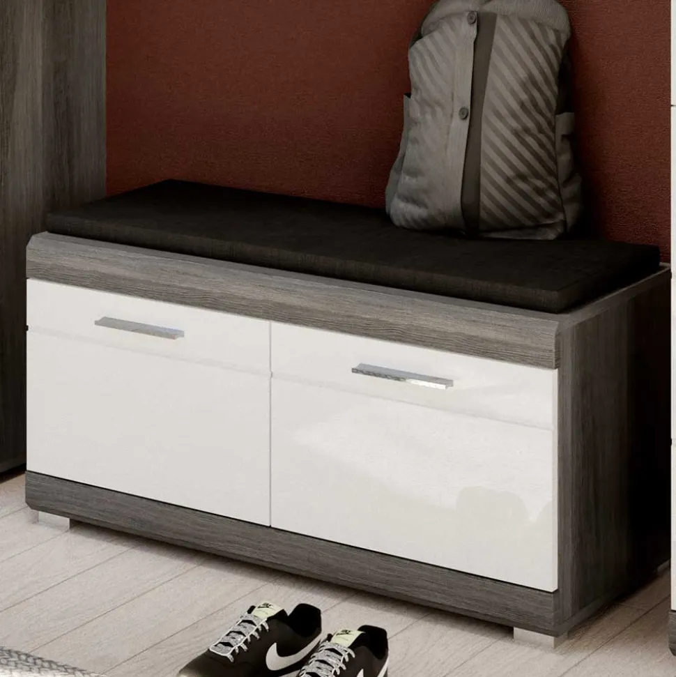 Die Schuhbank (90x44x40 cm) ist das Komfort-Highlight des Sets. Inklusive einer Sitzpolster Auflage. Zwei Türen mit Einlegeböden und Mittelwand bieten Platz für bis zu acht Paar Schuhe. Das lose Sitzkissen in Anthrazit mit Webstoffbezug (100 % Polyester) ist nicht nur bequem, sondern mit einem Reißverschluss auch pflegeleicht. Belastbar bis 90 kg – ideal, um beim Schuheanziehen bequem Platz zu nehmen.