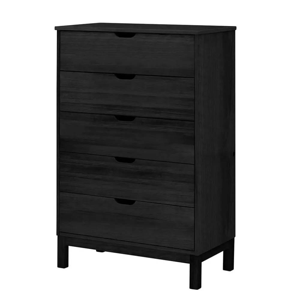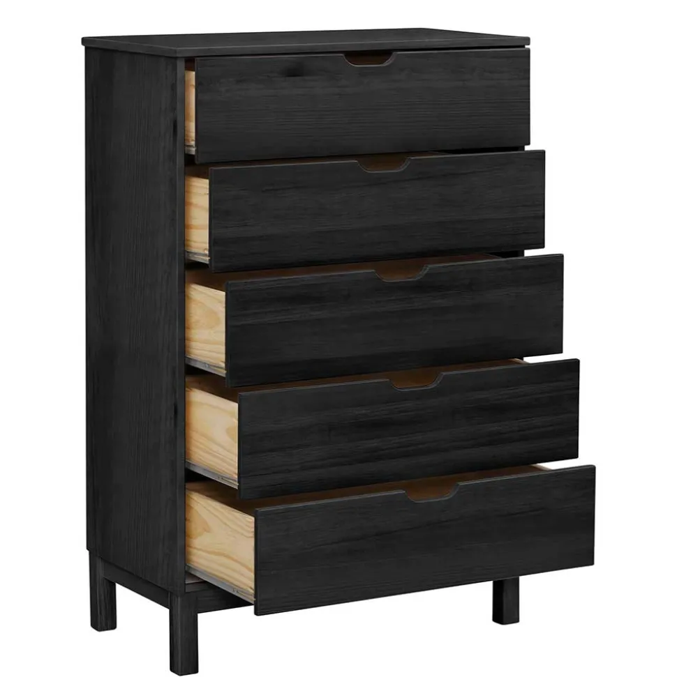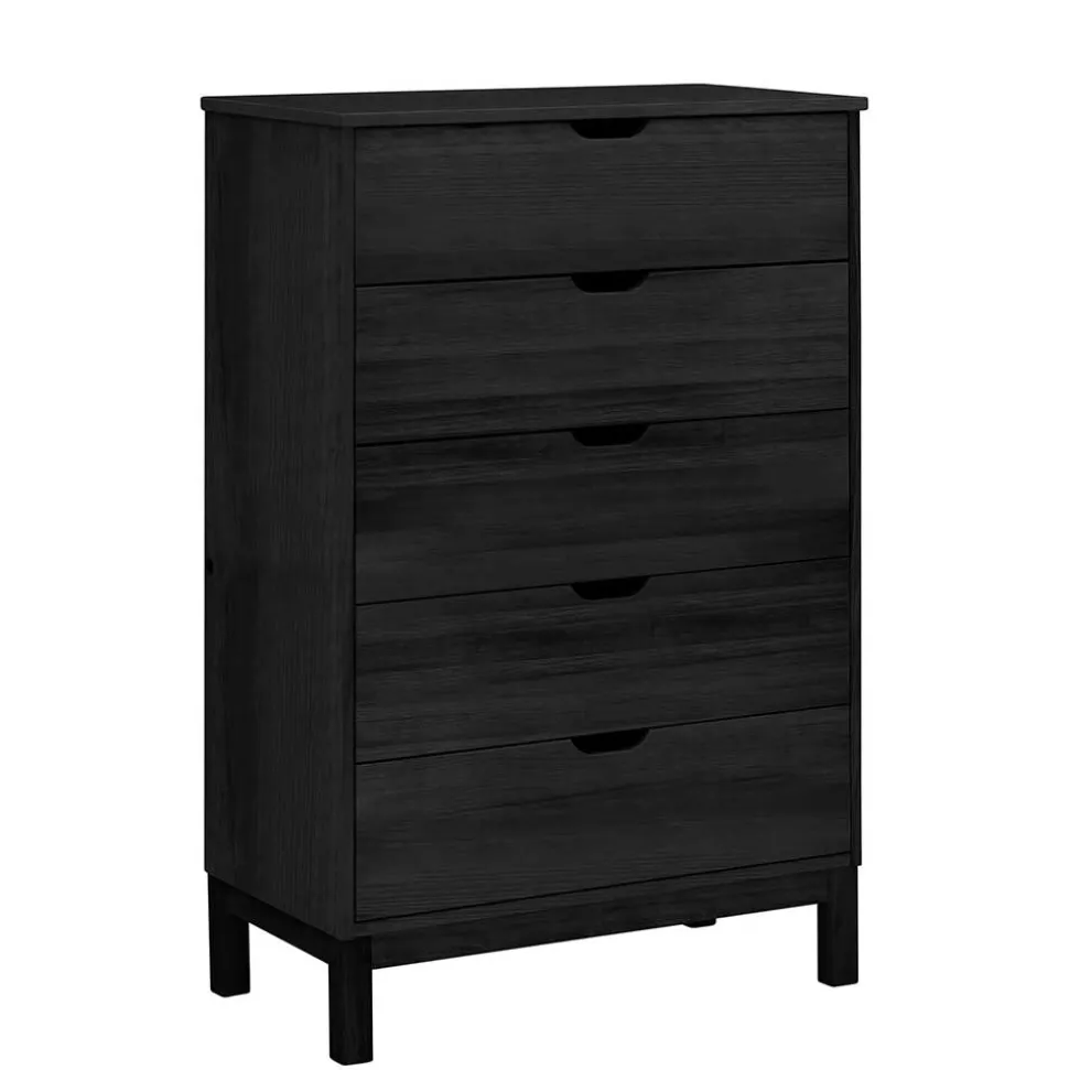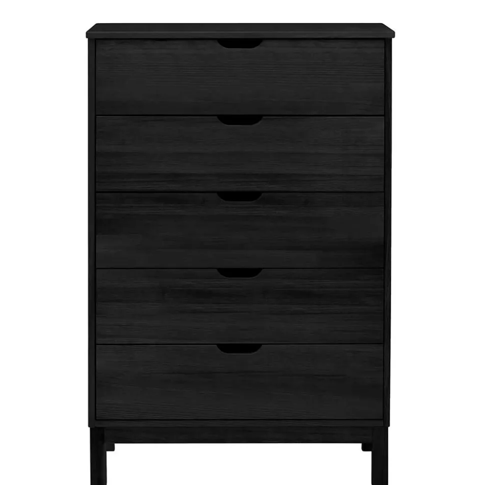 Gefertigt aus massivem Kiefernholz, überzeugt die Hochkommode durch ihre robuste Bauweise und Langlebigkeit. Die fünf geräumigen Schubladen mit Metallauszug bieten großzügigen Stauraum für Ihre persönlichen Gegenstände, wobei die ausgefrästen Griffmulden ein modernes und minimalistisches Design betonen. Die stabilen Vierfußgestelle aus Holz bieten einen sicheren Stand und sorgen für eine angenehme Bodenfreiheit von 15 cm.
