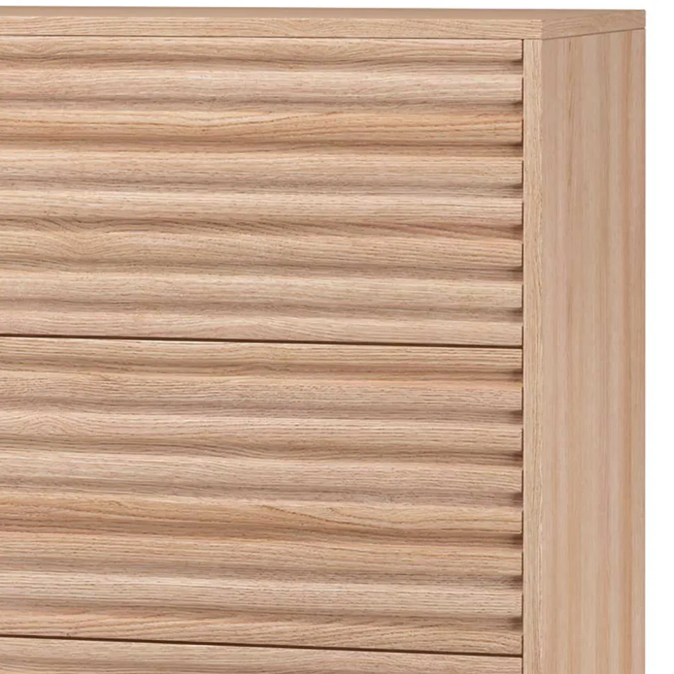 „Lunira“ überzeugt mit einer robusten Konstruktion aus MDF und Spanplatte, ergänzt durch ein filigranes, aber stabiles Metallgestell. Die pflegeleichten, in Eiche Natur folierten Oberflächen sorgen für eine warme Holzoptik, während dezente horizontale Rillen auf den Schubladenfronten das Design gekonnt auflockern. Das schwarze Vierfußgestell verleiht der Kommode eine moderne Leichtigkeit und gewährleistet sicheren Stand.