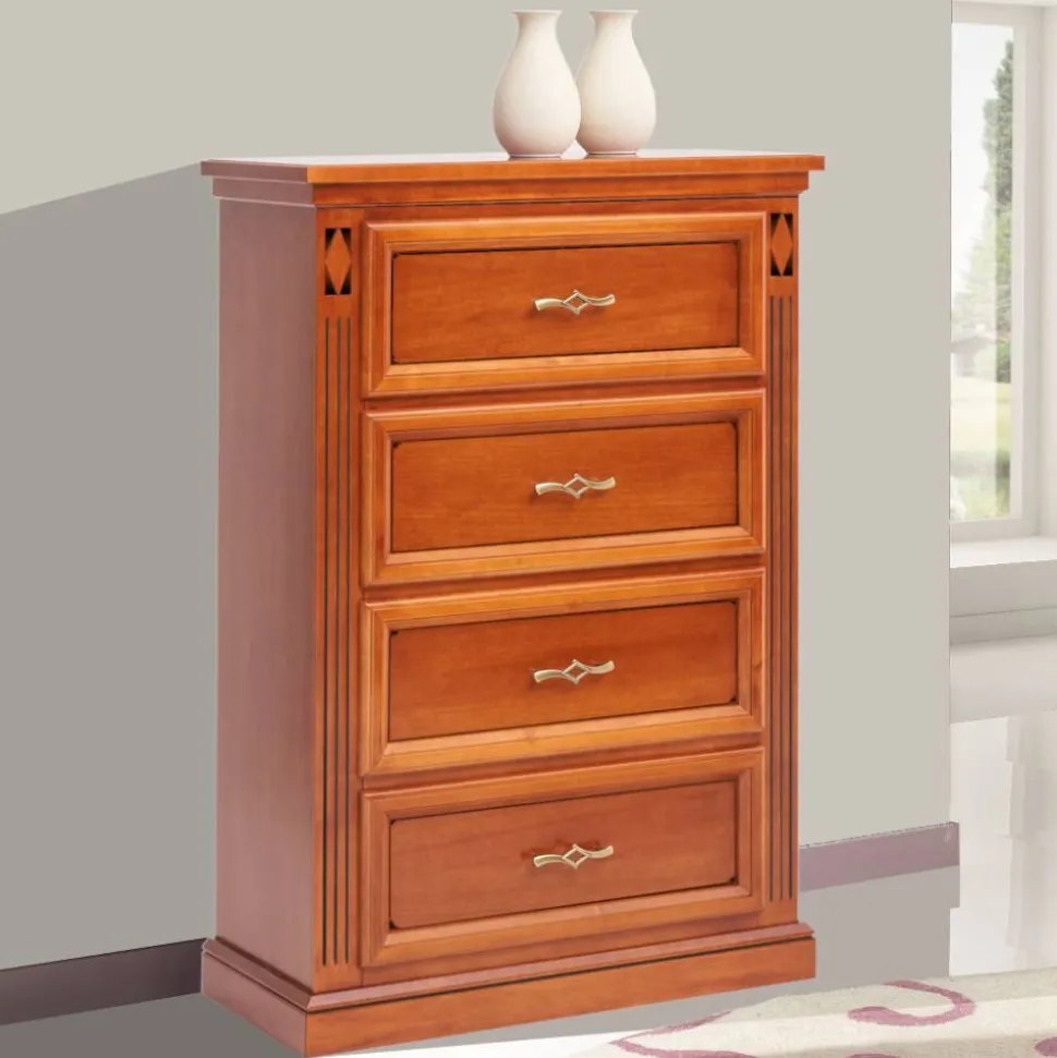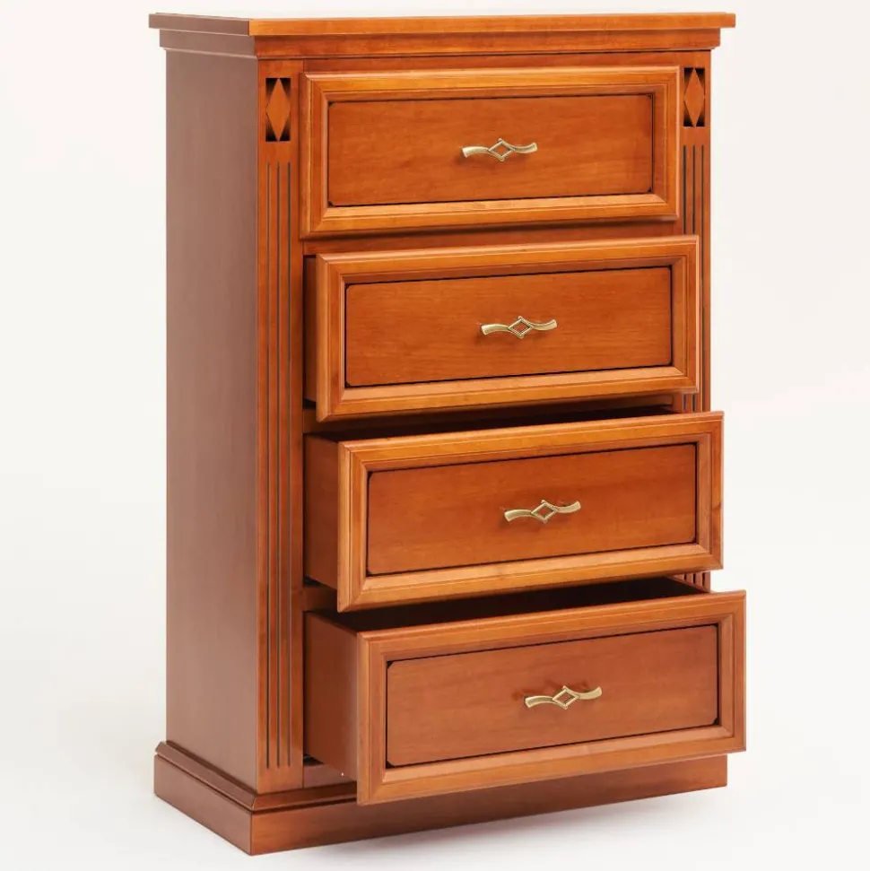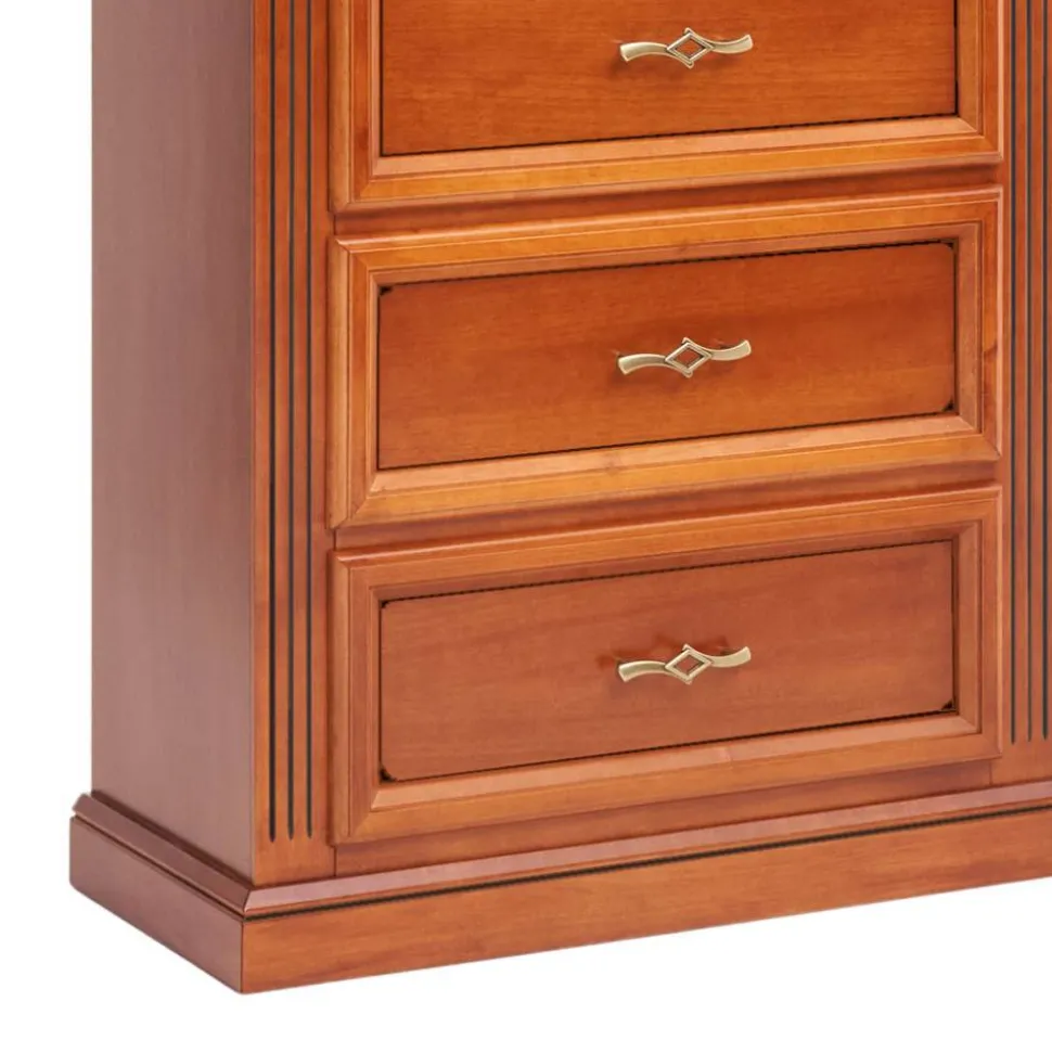 Gefertigt aus hochwertigem Holzwerkstoff, wurden die Oberflächen der Hochkommode aufwendig furniert, gebeizt und lackiert. Die abschließende Politur sorgt für einen authentischen Antik-Effekt, der die Kirschbaumoptik besonders edel zur Geltung bringt. Goldfarbene Metallgriffe setzen stilvolle Akzente und greifen das klassische Design elegant auf. Die handwerkliche Fertigung macht jedes Stück zu einem Unikat – kleine Maßabweichungen, Haarrisse oder Farbnuancen sind gewollt und unterstreichen die Individualität.