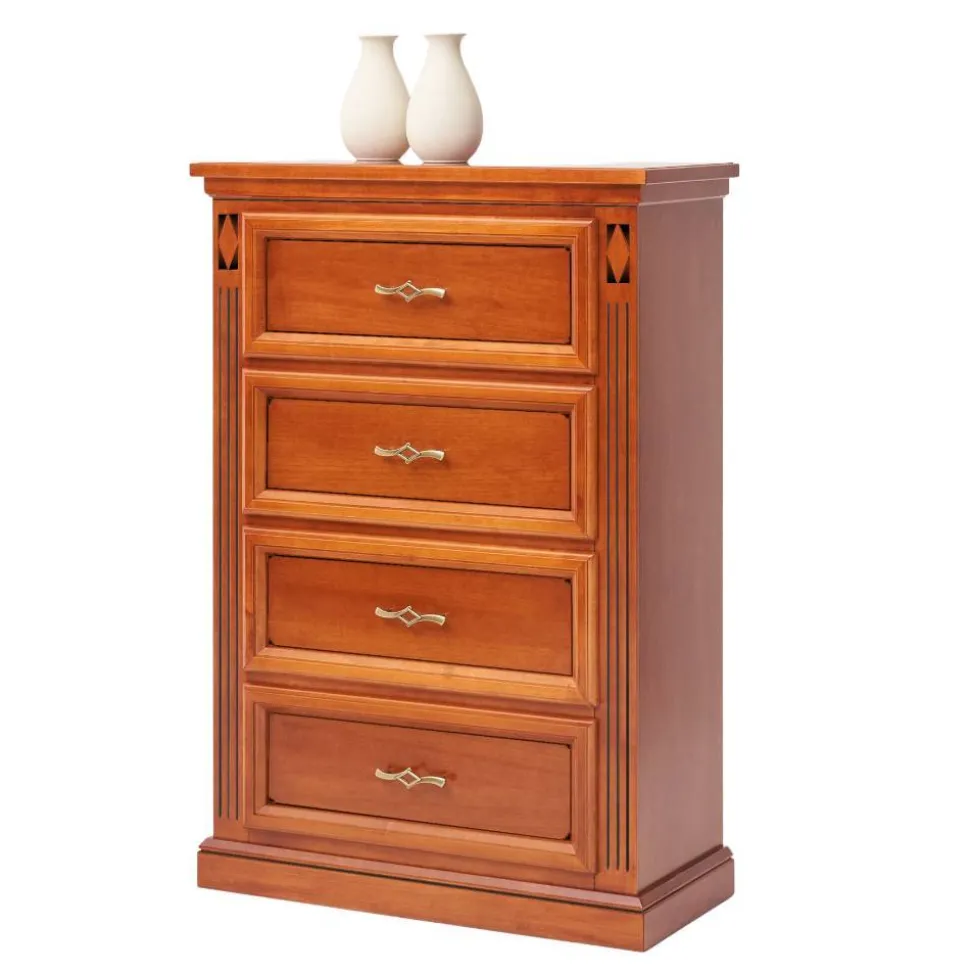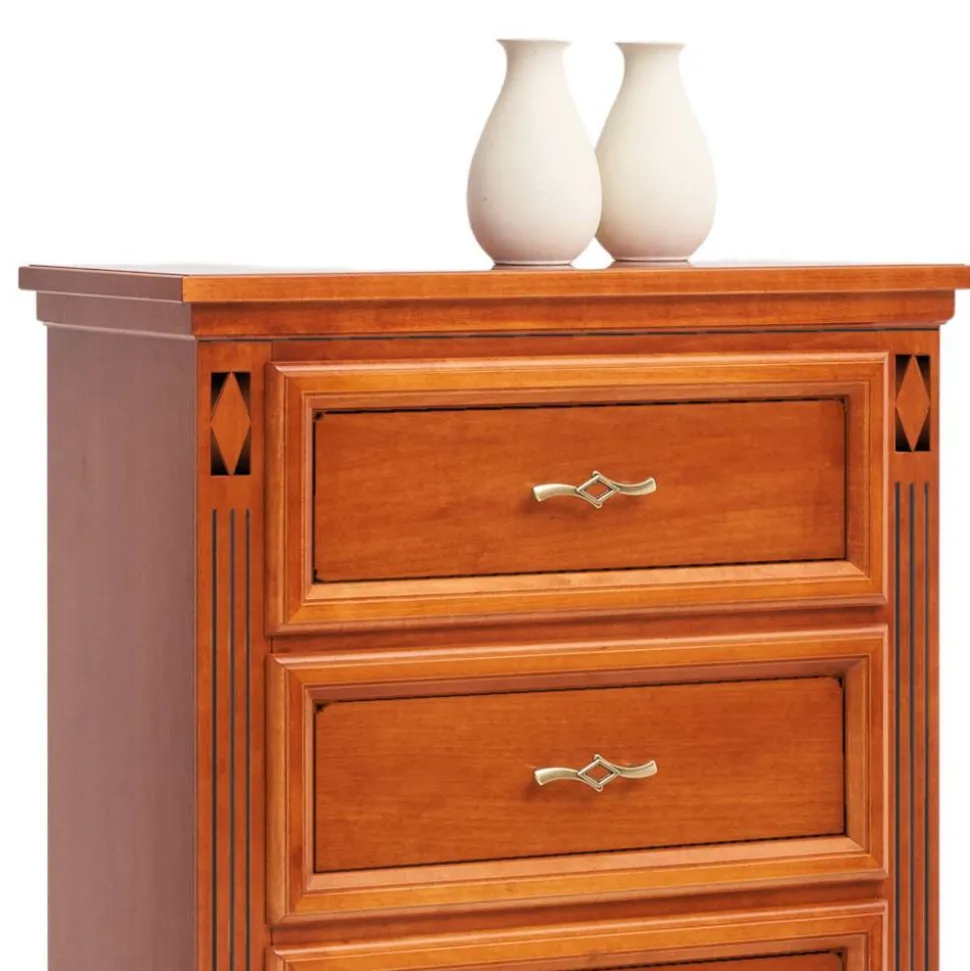 Mit ihrer klassisch-eleganten Ausstrahlung und der warmen Kirschbaumfarbe bringt die Hochkommode „Manukau“ ein charmantes Wohngefühl in Ihre Räume. Ob im Schlafzimmer, Flur oder Wohnbereich – dieses Möbelstück fügt sich harmonisch in verschiedenste Einrichtungsstile ein und überzeugt durch seine ausgewogene Kombination aus Funktion und Design. Die kunstvollen Zierleisten und feinen Fräsungen unterstreichen den hochwertigen Charakter und machen die Kommode zu einem echten Blickfang mit nostalgischem Flair.