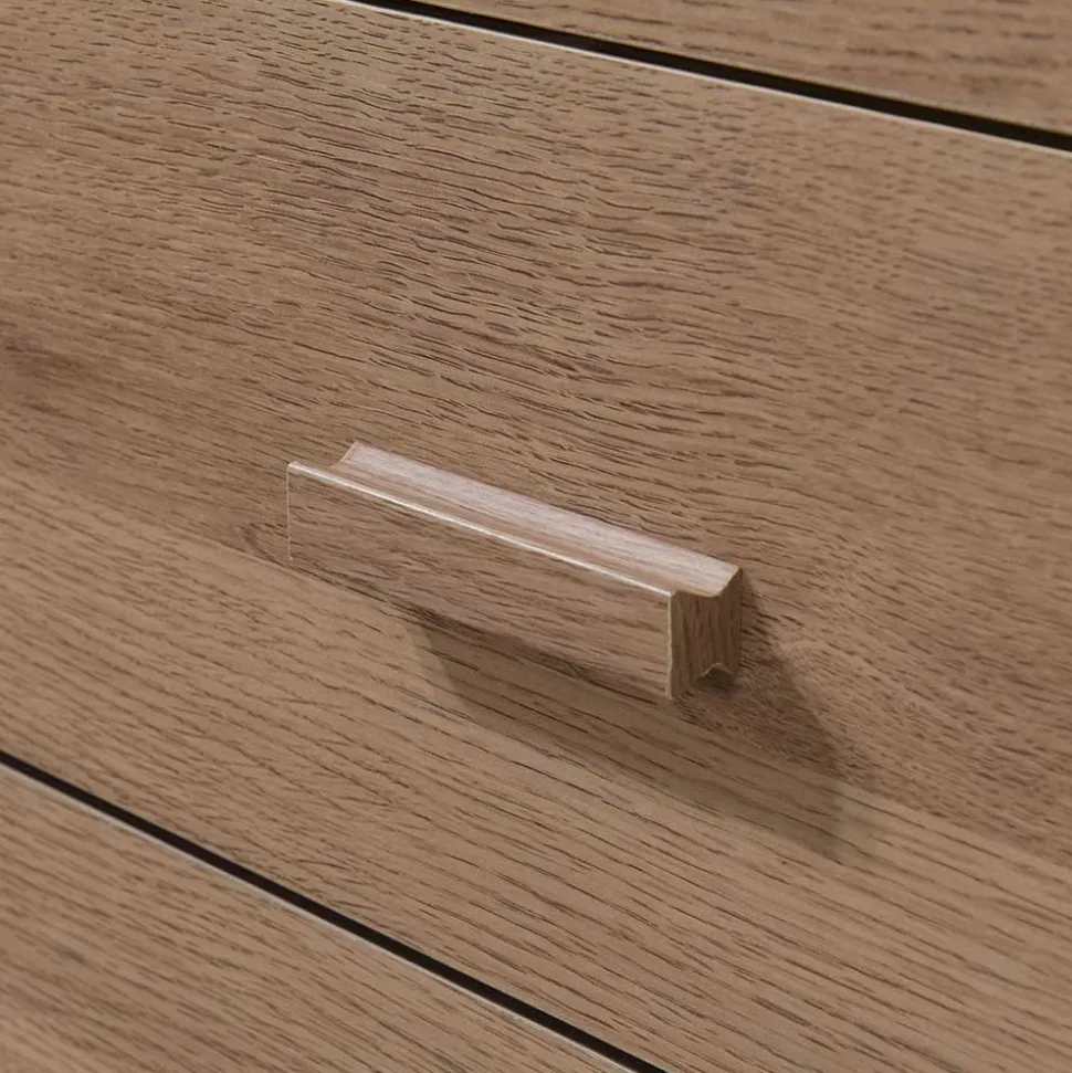 Die „Benns“ wird aus robustem Holzwerkstoff gefertigt und mit einer folierten Oberfläche in Eiche Holzoptik versehen. Das Vierfußgestell und die dekorative Blende in Holzoptik sowie die handlichen Griffleisten fügen sich harmonisch in das Design ein und sorgen für einen stimmigen Gesamteindruck.