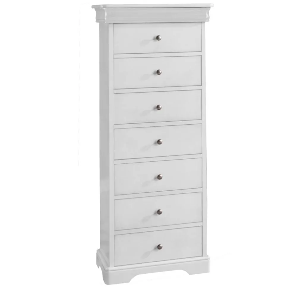 Mit insgesamt sieben Schubladen inklusive einer diskret versteckten Schublade oben bietet die Kommode großzügigen Platz für Ordnung und Übersicht. Das teilgeöffnete Sockelgestell verleiht dem Möbelstück eine elegante Leichtigkeit, während eine zusätzliche Kippsicherung für Stabilität sorgt.