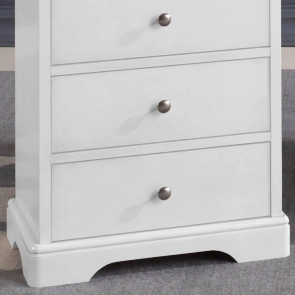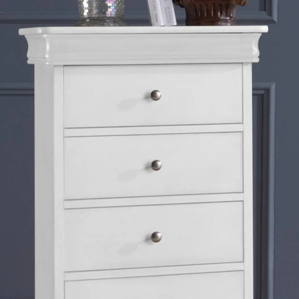Der Rahmen und das Gestell bestehen aus langlebigem Tulpenbaum-Massivholz, während die Schubladen aus Pappelholz gefertigt sind. Seiten und Deckplatte bestehen aus furniertem MDF. Die Oberflächen sind weiß lackiert und furniert, ergänzt durch nussbaumfarbene Beize und Lackierung, was der Kommode ihren charakteristischen Vintage Look verleiht. Runde Metall-Knopfgriffe in Altmessingfarben setzen dezente Akzente.