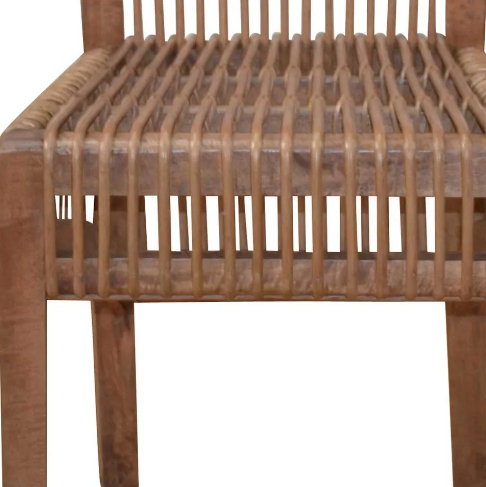 Rattan überzeugt nicht nur durch seine elegante Flechtstruktur, sondern auch durch seine hohe Elastizität und Widerstandsfähigkeit. Es passt sich dem Körper leicht an und sorgt so für spürbaren Sitzkomfort. Mangobaumholz – bekannt für seine markante Maserung und außergewöhnliche Härte – bringt Stabilität, Langlebigkeit und einen Hauch Exotik in Ihr Zuhause. Die Kombination dieser beiden Materialien steht für Qualität und Individualität, wie man sie nur bei handverarbeiteten Möbelstücken findet.