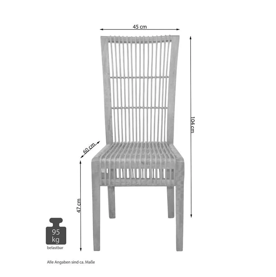 Mit einer Sitzhöhe von ca. 47,5 cm und einer großzügig gestalteten Lehnenhöhe von rund 59,5 cm bietet „Tiploma“ optimalen Halt und Komfort. Die angenehm breite Sitzfläche von 45 cm lädt zum Verweilen ein – ideal für lange Abende am Esstisch oder entspannte Stunden im Wintergarten. Dank der stabilen vier Massivholzbeine trägt der Stuhl bis zu 95 kg – zuverlässig, sicher und langlebig.