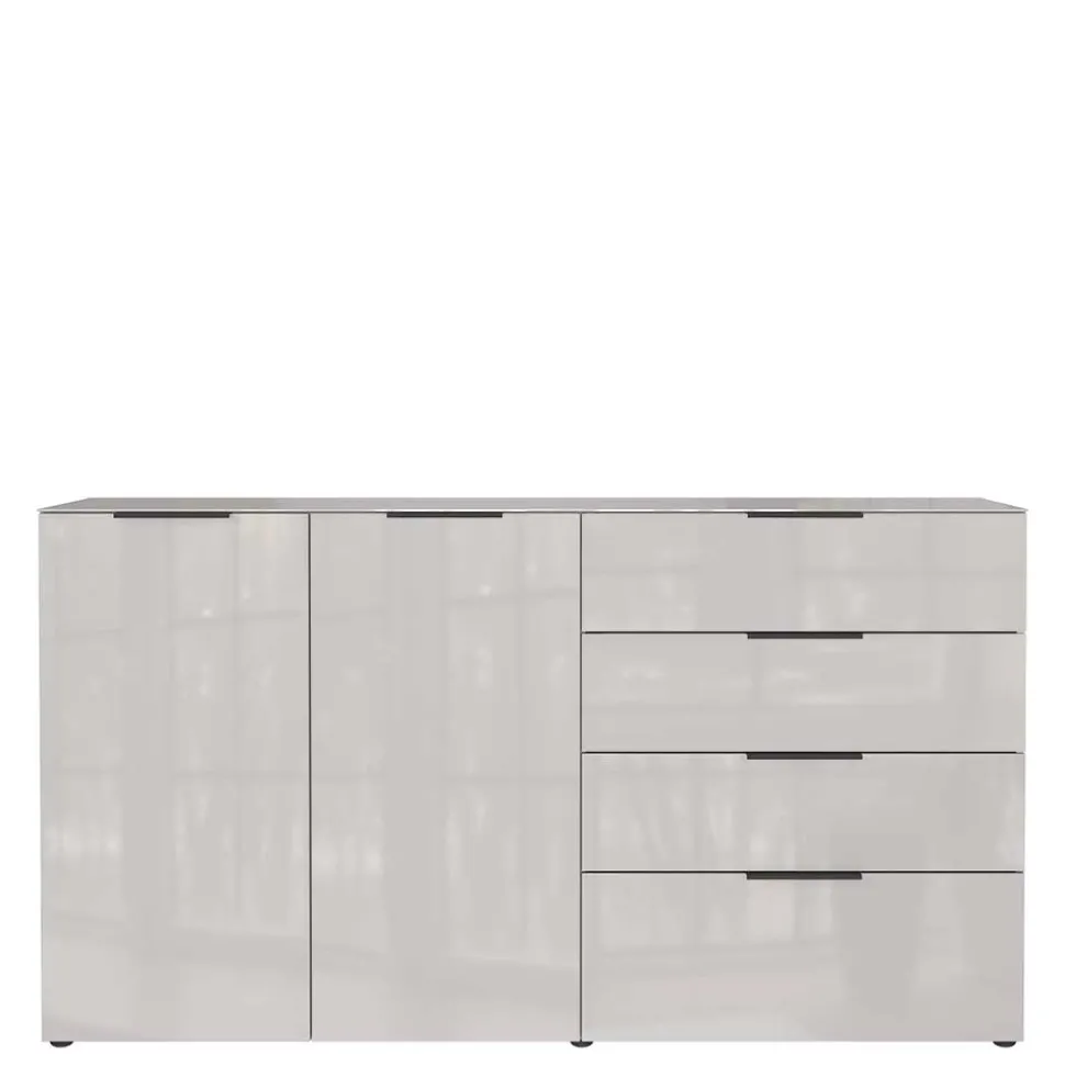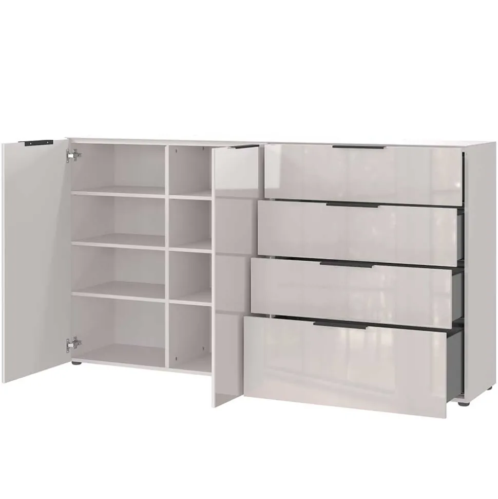 Modernität und zeitlose Eleganz verschmelzen im Design von Aquara zu einem harmonischen Gesamtbild. Hellgraue Oberflächen schaffen eine ruhige, freundliche Atmosphäre, während die Fronten durch ihre Glasbeschichtung eine stilvolle Tiefe und einen leichten Glanz erhalten. Einen starken, charaktervollen Akzent setzen die schwarz pulverbeschichteten Metall-Kantengriffe, die dem Möbelstück eine klare Linienführung und moderne Raffinesse verleihen. Dieses Sideboard ist mehr als nur ein Aufbewahrungsmöbel – es ist ein Statement für gehobene Wohnkultur.
