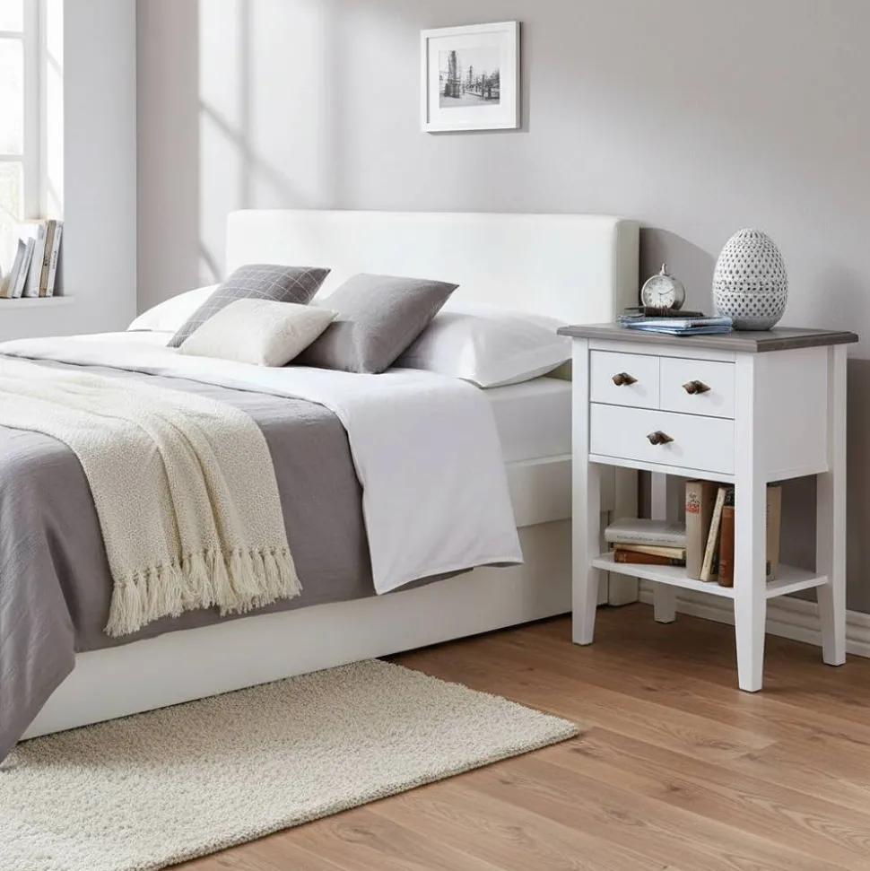 Die Kommode besteht aus einer Kombination von robustem Sperrholz für die Schubkastenrahmen, -böden und die Rückwand sowie massiver Kiefer, die sich durch ihre Haltbarkeit und Stabilität auszeichnet. Die Oberflächen in Weiß und Grau sind sorgfältig lackiert, was den Möbeln nicht nur einen attraktiven, zweifarbigen Look verleiht, sondern auch für zusätzlichen Schutz und leichte Pflege sorgt. Die natürliche Maserung der Kiefer schimmert durch die Lackierung hindurch und verleiht der Kommode einen einzigartigen Charakter.