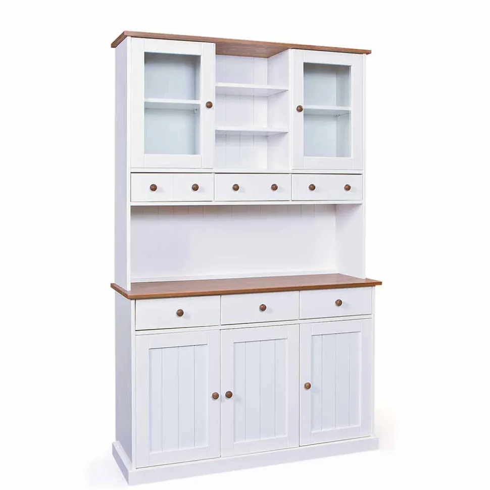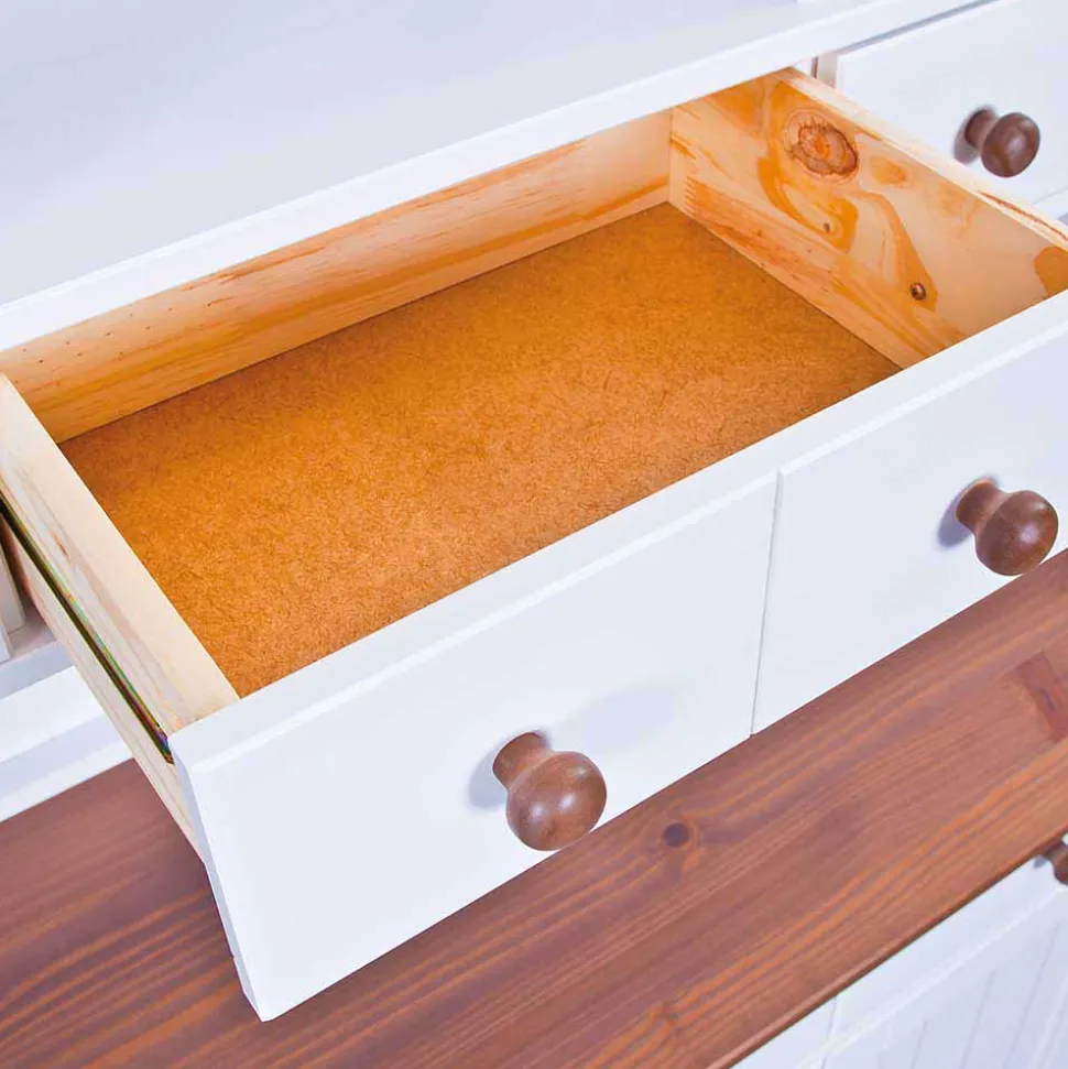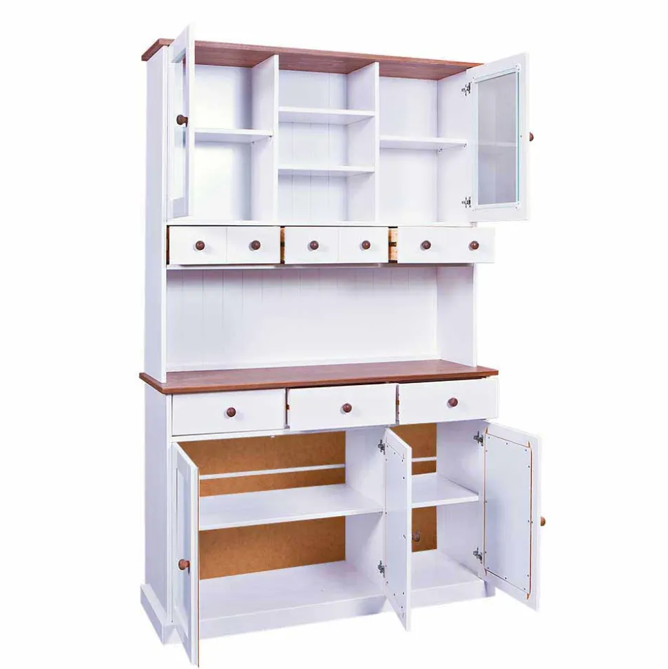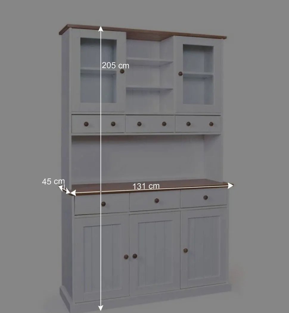 Hinter den Türen verbirgt sich ein durchdachtes Innenleben: Jede Sektion ist mit einem Einlegeboden ausgestattet, der Ihnen hilft, Ordnung zu halten und Ihre Gegenstände übersichtlich zu verstauen. Im Aufsatz befinden sich zudem drei kleine offene Fächer und ein großes Mittelfach, ideal zur Präsentation von Büchern, Fotos oder Erinnerungsstücken. Die Rückwand in Paneeloptik verleiht diesen Fächern zusätzliche Eleganz und Tiefe. Ergänzt wird die Funktionalität durch sechs Schubladen mit robustem Metallauszug, die weiteren Stauraum für kleinere Gegenstände bieten. Die runden Knopfgriffe aus Holz runden das harmonische Gesamtbild ab.