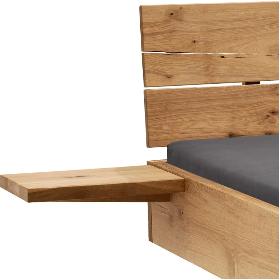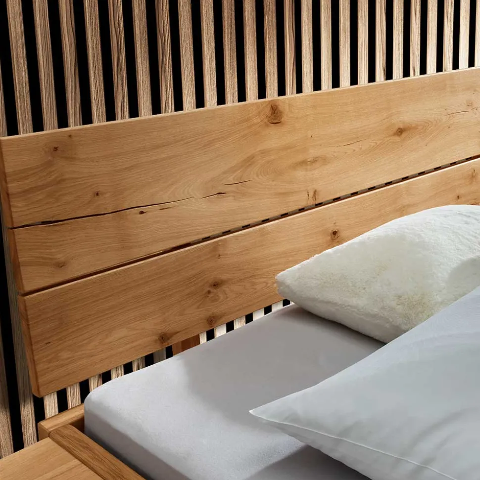 Das Bettgestell ist aus massiver Wildeiche gefertigt, einem Holz, das für seine Robustheit und Langlebigkeit bekannt ist. Wildeiche hat einen sehr individuellen Charakter mit Wuchsrisse und Astlöcher, die jedes Stück zu einem Unikat machen. Diese natürlichen Eigenschaften verleihen dem Bett eine authentische, erdverbundene Ausstrahlung. Die Holzoberfläche ist natürlich geölt, was nicht nur die einzigartige, lebendige Maserung des Holzes hervorhebt, sondern auch einen zusätzlichen Schutz bietet und die Pflege erleichtert.