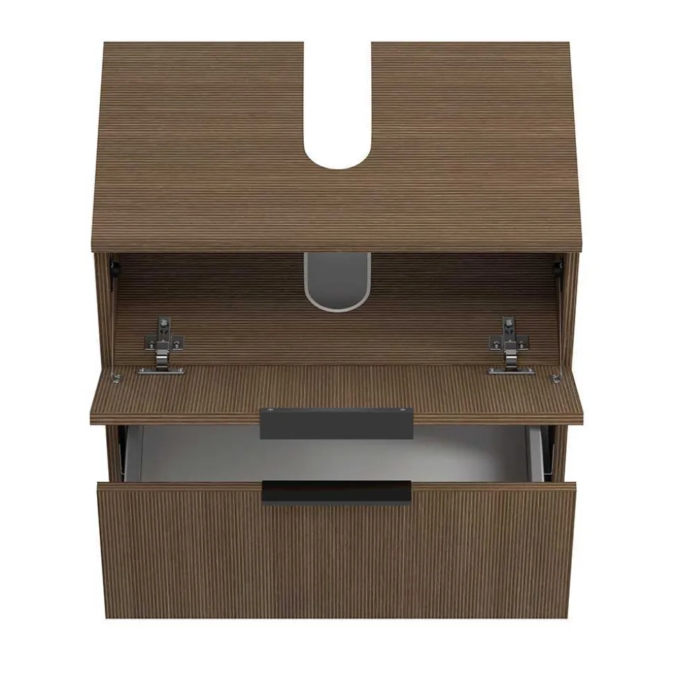 Sinnvolle Funktionalität vereint sich im Waschbeckenschrank, der sowohl eine obere Klappe als auch eine geräumige Schublade beherbergt. Beide Elemente sind mit hochwertigen Metallauszügen ausgestattet, die durch Soft-Close-Technik ein leises, komfortables Schließen ermöglichen. In der Deckplatte ist ein vorgefertigter Siphon-Ausschnitt integriert, der die Installation des Waschbeckens erleichtert. Die teilgeöffnete Rückwand sorgt dafür, dass Zu- und Abläufe problemlos angeschlossen werden können, ohne das Möbelstück umständlich anpassen zu müssen. Schwarze Metall-Kantengriffe greifen das elegante Designkonzept auf und setzen funktionale Akzente. Wie beim Midischrank haben Sie auch hier die Wahl: hängende Montage für einen modernen, schwebenden Look oder stehende Montage auf den mitgelieferten Kunststoff-Füßen mit einer Höhe von 5 cm, die nicht nur Stabilität, sondern auch Pflegeleichtigkeit des Bodens garantieren. Bitte beachten Sie: Das Waschbecken ist nicht im Lieferumfang enthalten, sodass Sie Ihr persönliches Wunschbecken frei wählen können.