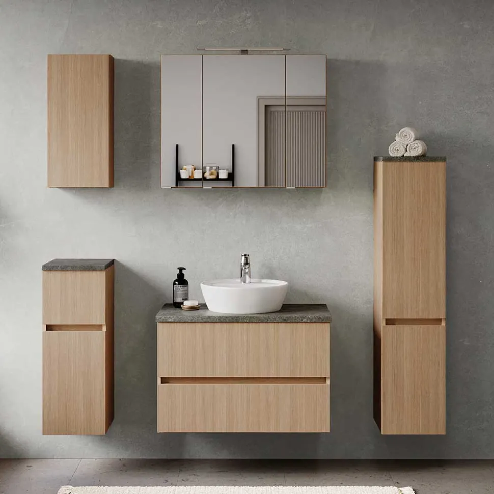 Natürlich, funktional und bis ins Detail durchdacht – das Badezimmermöbel Set „Leitha“ vereint ansprechendes Design mit praktischer Funktionalität. Die helle Eichenholzoptik des Korpus mit fühlbarer Struktur sorgt für eine warme, einladende Atmosphäre, während die tiefgezogenen Deckplatten in dunkler Steinoptik für einen modernen Kontrast sorgen. Mit dieser hochwertigen Kombination holen Sie sich ein harmonisches Ambiente in Ihr Badezimmer, das stilvolle Ästhetik mit langlebiger Qualität verbindet.