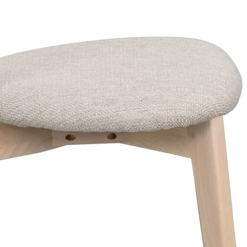 Gefertigt aus hochwertigem, massivem Eichenholz, vereint der Stuhl Mikene Langlebigkeit mit natürlicher Schönheit. Eichenholz ist bekannt für seine Robustheit, Stabilität und die charakteristische Maserung, die jedem Möbelstück einen einzigartigen Charakter verleiht. Die mit einem White-Wash-Effekt veredelten Holzoberflächen bewahren die natürliche Anmutung des Materials und verleihen ihm zugleich eine moderne Leichtigkeit. Dieser Effekt schützt das Holz zudem vor äußeren Einflüssen und macht es besonders pflegeleicht – ideal für den Alltag.