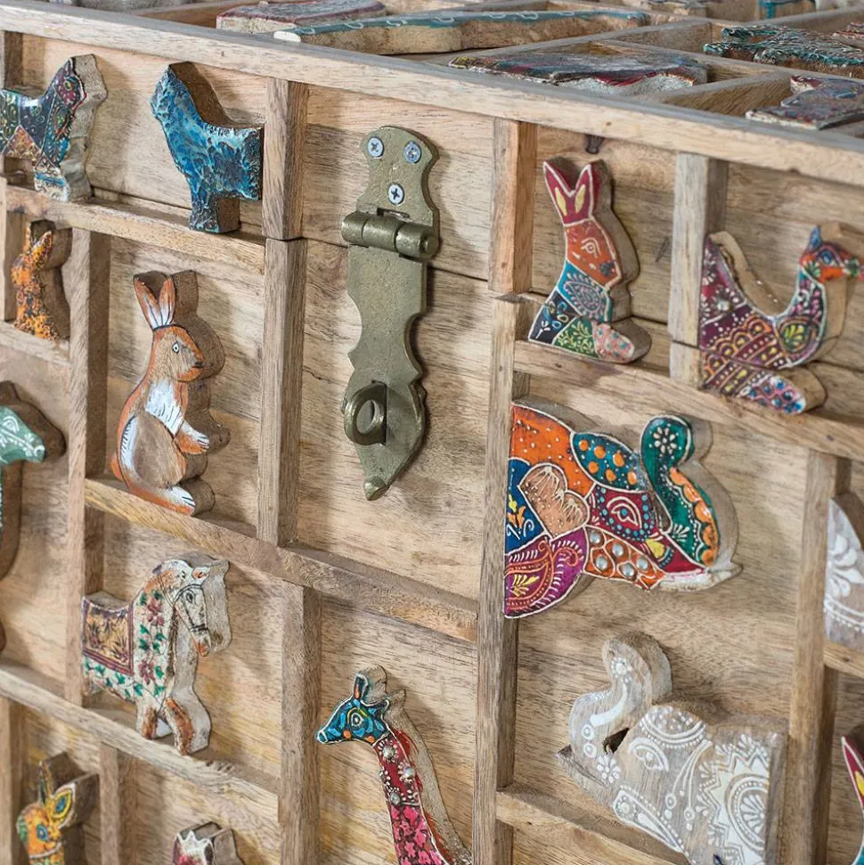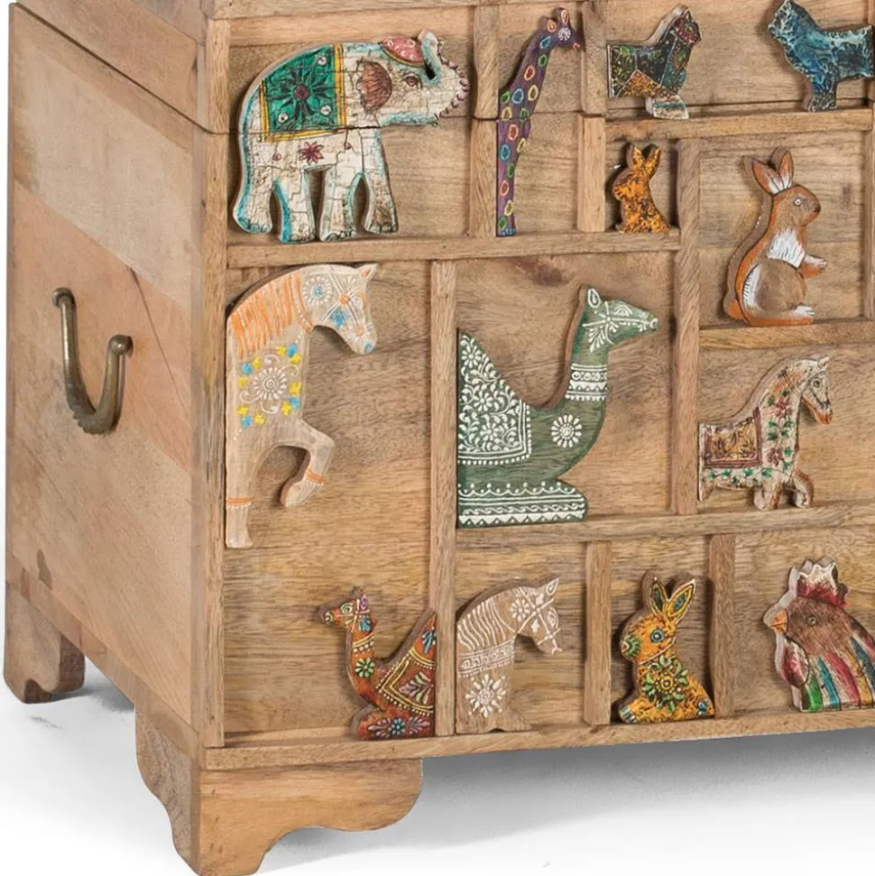 Ein besonderes Highlight ist die liebevoll verzierte Front sowie der aufwendig gestaltete Deckel. Die Oberfläche ist durch filigrane Leisten in unterschiedliche rechteckige und quadratische Segmente unterteilt, die an einen kunstvollen Setzkasten erinnern. Innerhalb dieser Felder finden sich plastische, farblich variierende Tiermotive – mal dezent in Weiß gehalten, mal kunstvoll bunt bemalt oder mit detailreichen Mustern versehen. Diese verspielte, aber dennoch harmonische Gestaltung macht die Truhe zu einem einzigartigen Blickfang.