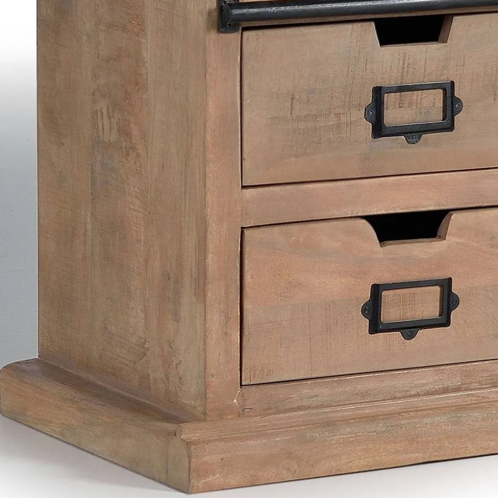 Hinter den beiden rustikalen Metall-Schiebetüren verbergen sich vier Fächer mit zwei Einlegeböden – ideal für Receiver, Spielkonsolen oder andere Multimediageräte. Zusätzlich sorgen vier geräumige Schubladen mit Holzauszügen für Ordnung, sodass DVDs, Kabel oder Fernbedienungen immer griffbereit verstaut sind. Die ausgefrästen Griffmulden ermöglichen ein komfortables Öffnen, während die Schubladenfronten mit Metall-Etikettenhaltern versehen sind – perfekt, um Übersicht zu behalten und gleichzeitig den Industrial Look zu unterstreichen.