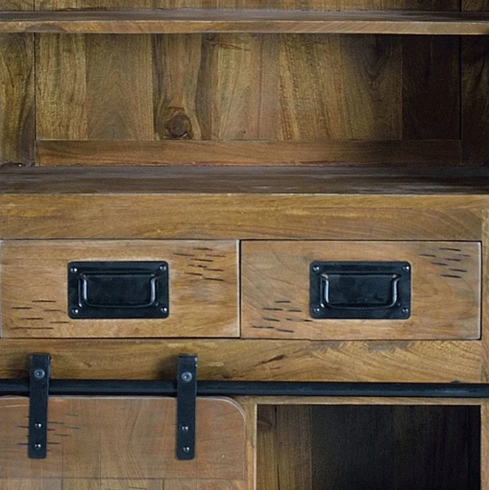 Verleihen Sie Ihrem Zuhause einen rustikalen Charme mit dem Industrial Design Barschrank „Semian“. Dieses außergewöhnliche Möbelstück vereint natürliche Materialien und authentische Details, die es zu einem wahren Unikat machen. Der Barschrank besticht durch seine natürliche Mangoholz-Oberfläche in warmen Naturtönen, gepaart mit dezenten schwarzen Metall-Applikationen, die ihm seinen markanten Industrial-Look verleihen. Die Schiebetür in Scheunentor-Optik und die dekorativen Metallschilder an der Front unterstreichen seinen rustikalen Charakter. Durch die individuelle Fertigung und die handgearbeiteten Details variiert jede Einheit in Oberflächenstruktur und Farbgebung, wodurch jedes Modell zu einem echten Einzelstück wird.