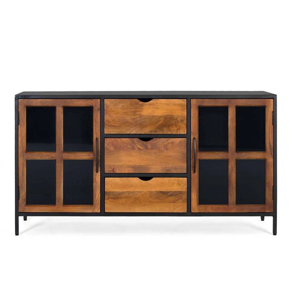 Gefertigt aus massivem Mangoholz überzeugt die Kommode „Hayato“ mit einer ausdrucksstarken Maserung und warmen Naturfarben, die in perfektem Kontrast zum schwarzen Metallgestell stehen. Mangoholz ist nicht nur optisch ein Highlight, sondern auch besonders langlebig und robust. Ergänzt wird das edle Design durch Glaseinsätze in den Türen, die das Sideboard optisch auflockern und eine stilvolle Präsentation Ihrer Lieblingsstücke ermöglichen. Jedes Exemplar wird aufwendig von Hand bearbeitet – so entsteht ein individuelles Möbelstück mit einzigartiger Struktur und natürlichen Farbnuancen.