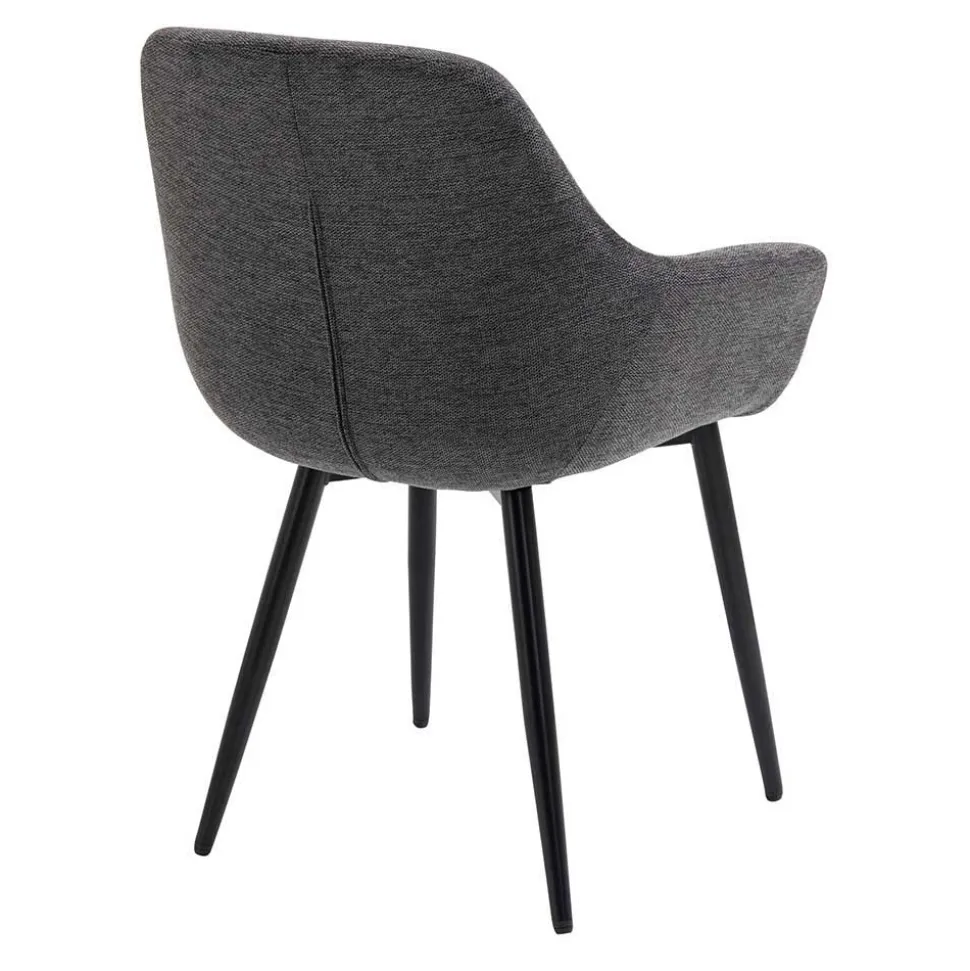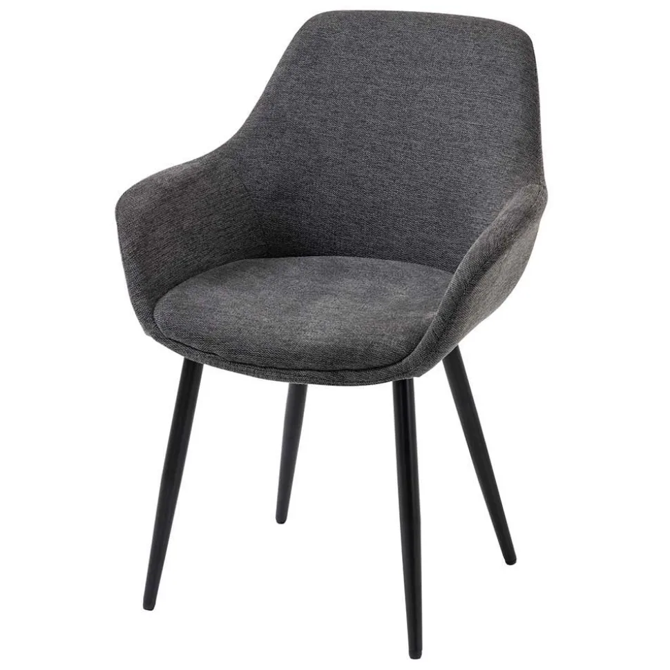 Die vier Armlehnenstühle überzeugen mit einem strapazierfähigen Strukturwebstoff in Anthrazit. Die Polsterung aus hochwertigem Schaumstoff bietet angenehmen Sitzkomfort, während die stabilen, schwarz pulverbeschichteten Metallbeine mit ihrer konisch zulaufenden Form für ein harmonisches Gesamtbild sorgen.