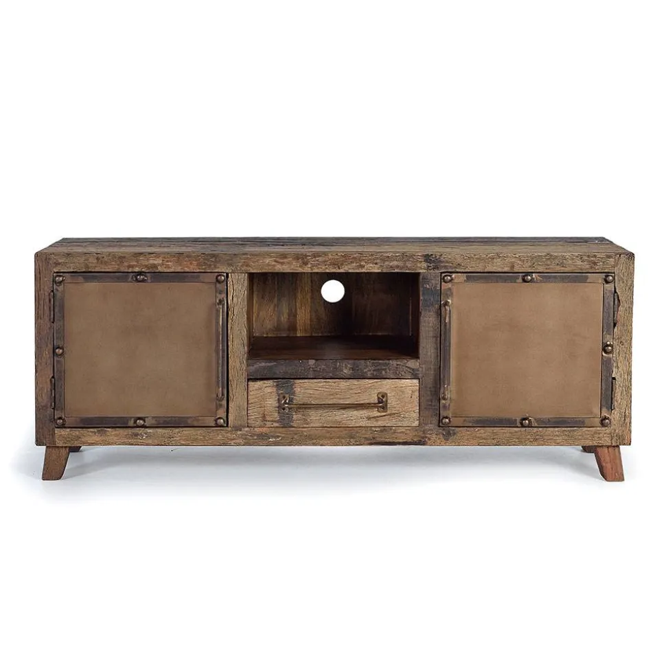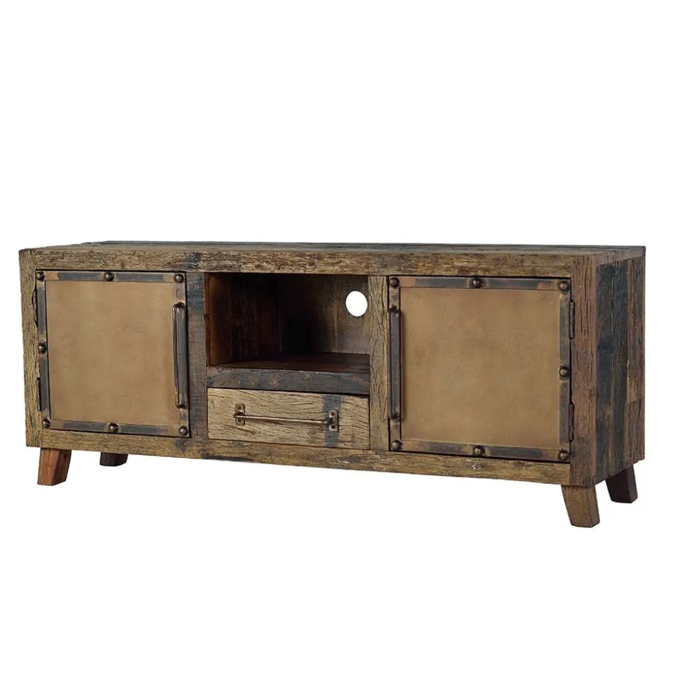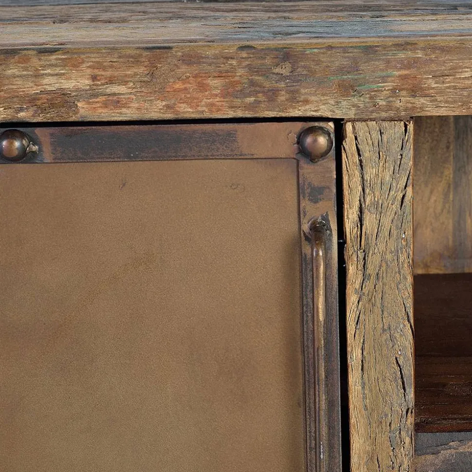 Die TV-Kommode „Stock“ ist nicht nur optisch ein Highlight, sondern auch funktional bestens ausgestattet. Das Möbelstück besteht aus massivem Altholz, dessen natürliche Gebrauchsspuren und charakteristische Risse jedes Stück zu einem einzigartigen Unikat machen. Das stabile Fußgestell aus Massivholz sorgt für sicheren Stand und verleiht dem Design einen soliden, stabilen Charakter. Ergänzt wird das Möbelstück durch Metall-Elemente, die in verschiedenen Oxidationsschattierungen glänzen und ihm einen besonders rustikalen Touch verleihen. Lange Metallbügelgriffe in Altmessingfarben runden das Gesamtbild ab und setzen zusätzliche Akzente.