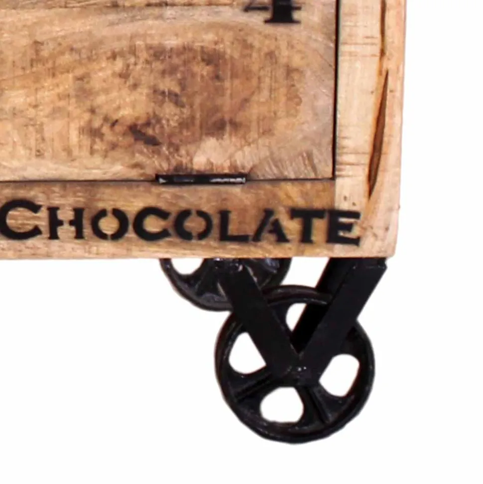 Die vier markanten Eisenrollen machen den Schrank praktisch rollbar und fügen einen Hauch von Industrial Chic hinzu. Die Ringgriffe aus Metall, in Vintage-Schwarz lackiert, setzen einen schönen Kontrast zum warmen Mangobaumholz.