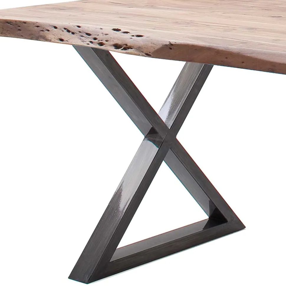Besonders auffällig sind die einzigartigen Naturkanten an den Längsseiten der Tischplatte, die direkt aus dem Stamm geschnitten wurden. Diese natürlichen Unregelmäßigkeiten machen jeden Tisch zu einem Unikat. Mit einer beeindruckenden Stärke von etwa 5,5 cm bietet die massive Tischplatte nicht nur eine ansprechende Optik, sondern auch außergewöhnliche Stabilität. Das schmucke Metallgestell mit zwei X-Elementen und einer breiten Standfläche sorgt für einen stabilen Stand und verleiht dem Tisch ein markantes, industrielles Flair. Bei den Varianten 002 und 003 können die X-Elemente versetzt angebracht werden, um den individuellen Wünschen gerecht zu werden.