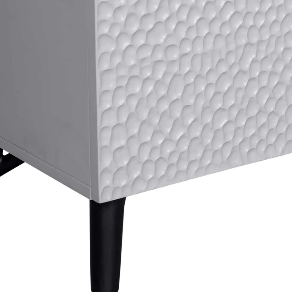 Die Oberflächen des Barschranks sind pflegeleicht lackiert, was ihn besonders pflegefreundlich macht und Ihnen gleichzeitig eine lange Lebensdauer garantiert. Die Türen und die Klappe sind aus geschnitztem Mangoholz gefertigt, das mit einer einzigartigen 3D-Struktur versehen ist – so entsteht eine individuelle und faszinierende Optik, die mit jedem Blick neue Details preisgibt. Der Korpus besteht aus stabilem Kiefernholz, das zusammen mit den Einlegeböden aus Spanplatte und der Rückwand aus HDF für eine robuste Konstruktion sorgt. Abgerundet wird der Look durch das schwarze Metall-Fußgestell, das dem Barschrank eine moderne Leichtigkeit verleiht.
