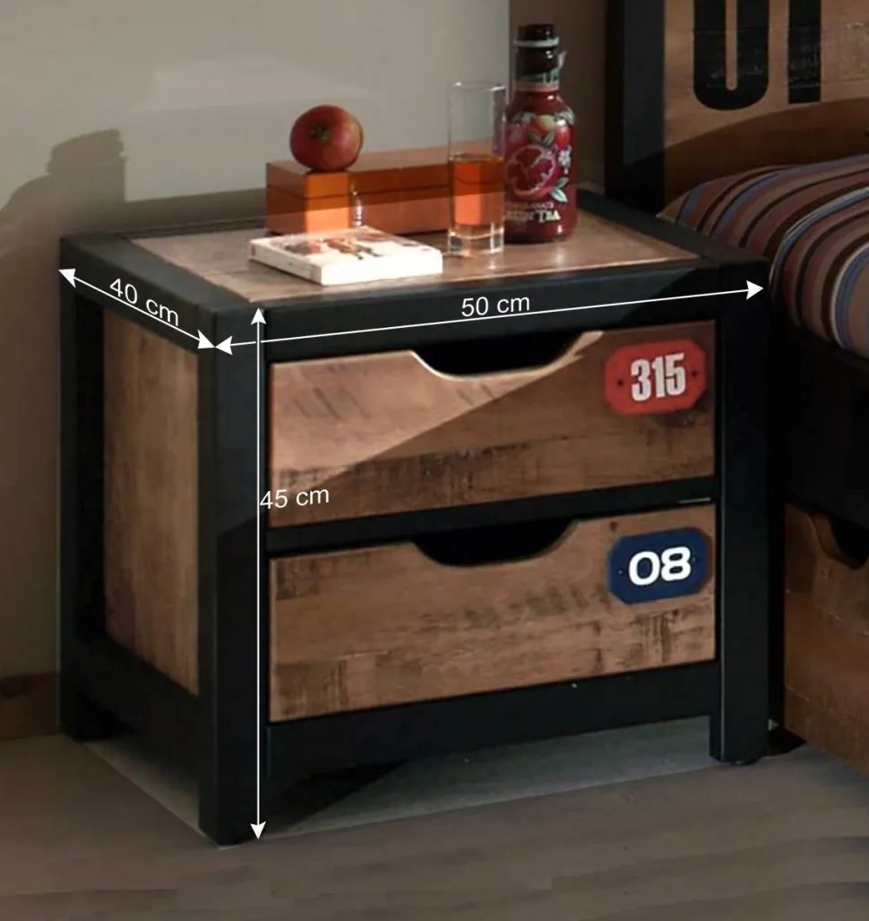 Sie haben nach einer umfangreichen Komplett-Einrichtung für Ihr bemerkenswertes Jugendzimmer gesucht? Das Jugendzimmermöbel Set Krefos könnte genau das Richtige für Sie sein! Mit einem modernen Design, das eine markante Industrial Note mit einem natürlich-rustikalen Charakter verbindet, zieht dieses Set alle Blicke auf sich. Die zweifarbige Gestaltung in Cognac Braun mit Schwarz verleiht Ihrem Raum eine einzigartige Atmosphäre. Auf den Möbelstücken sind Zahlen und Applikationen aufgebracht, die den besonderen Look noch einmal betonen und Ihrem Zimmer einen individuellen Touch verleihen. Dabei setzen wir auf teilmassive Möbel aus hochwertigem Kiefernholz, die nicht nur robust und langlebig sind, sondern auch leicht zu pflegen.