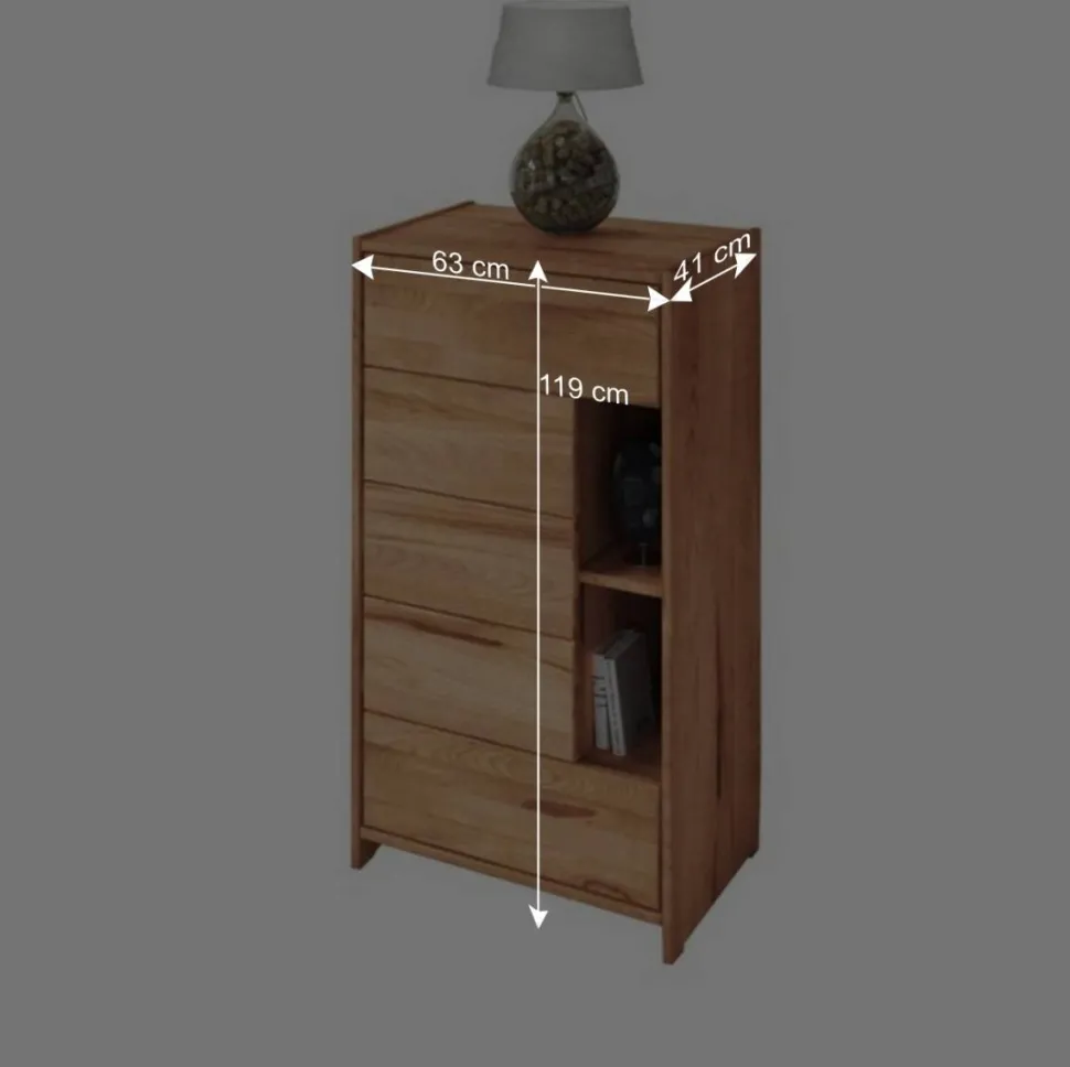 Mit ihren Maßen von 63 cm Breite, 119 cm Höhe und 41 cm Tiefe bietet die „Salomonia“ ausreichend Stauraum, ohne dabei aufdringlich zu wirken. Die fünf Schubladen, ausgestattet mit Metallauszug und Soft-Close-System, ermöglichen ein sanftes und leises Schließen – eine Kombination aus Komfort und Modernität. Die Schubladenkommode verfügt über eine grifflose Gestaltung, die ihre schlanke Silhouette betont und in jedem Wohnbereich für Aufsehen sorgt. Zwei offene Fächer bieten Raum für Ihre liebsten Deko-Objekte oder eine Auswahl an Büchern, die Sie gerne jederzeit griffbereit haben möchten.