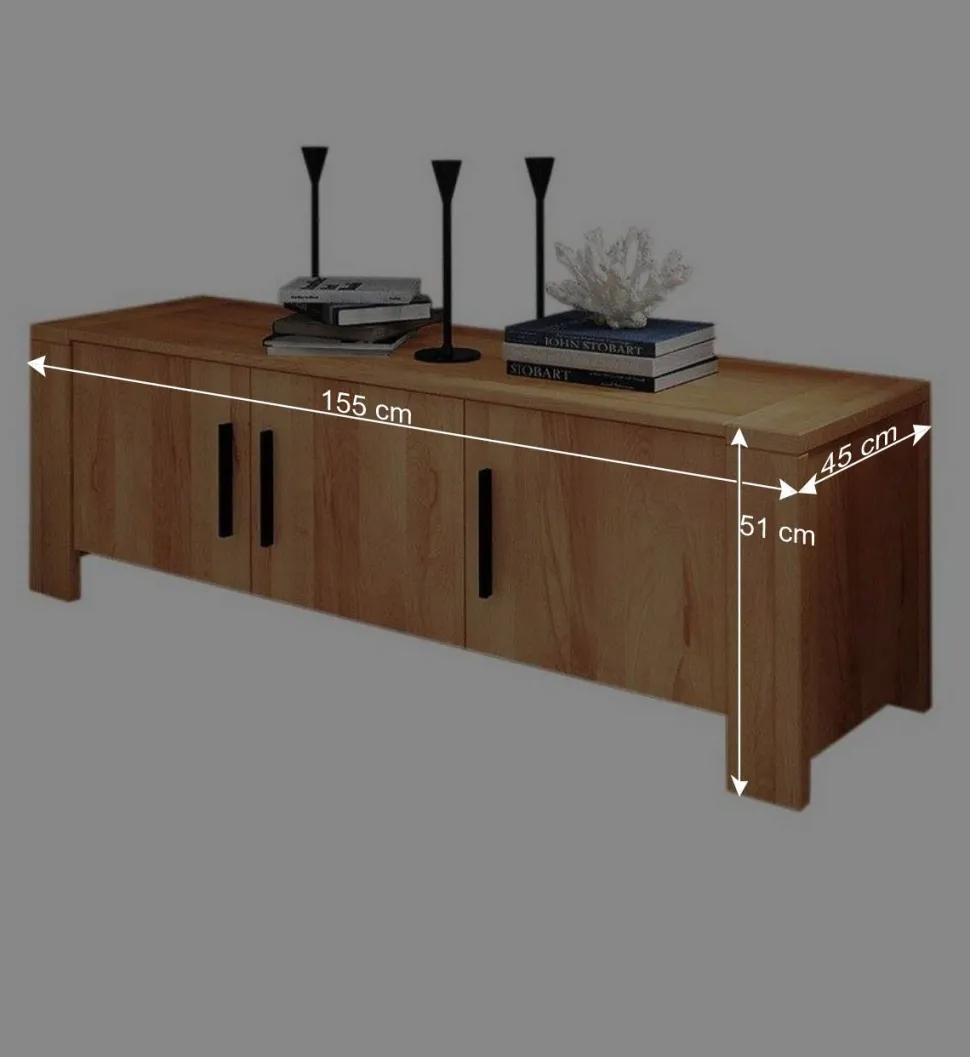Mit einer Materialstärke von 2 cm für die Deckplatte und die Seiten ist das Lowboard „Mosniak“ äußerst robust und langlebig. Es misst 155 cm in der Breite, 51 cm in der Höhe und 45 cm in der Tiefe, wodurch es ausreichend Stauraum für Ihre persönlichen Gegenstände bietet. Drei Türen mit Soft-Close-Mechanismus ermöglichen einen sanften und geräuschlosen Verschluss. Im Inneren finden Sie keine Einlegeböden, was Ihnen die Freiheit gibt, das Lowboard nach Ihren individuellen Bedürfnissen zu gestalten.