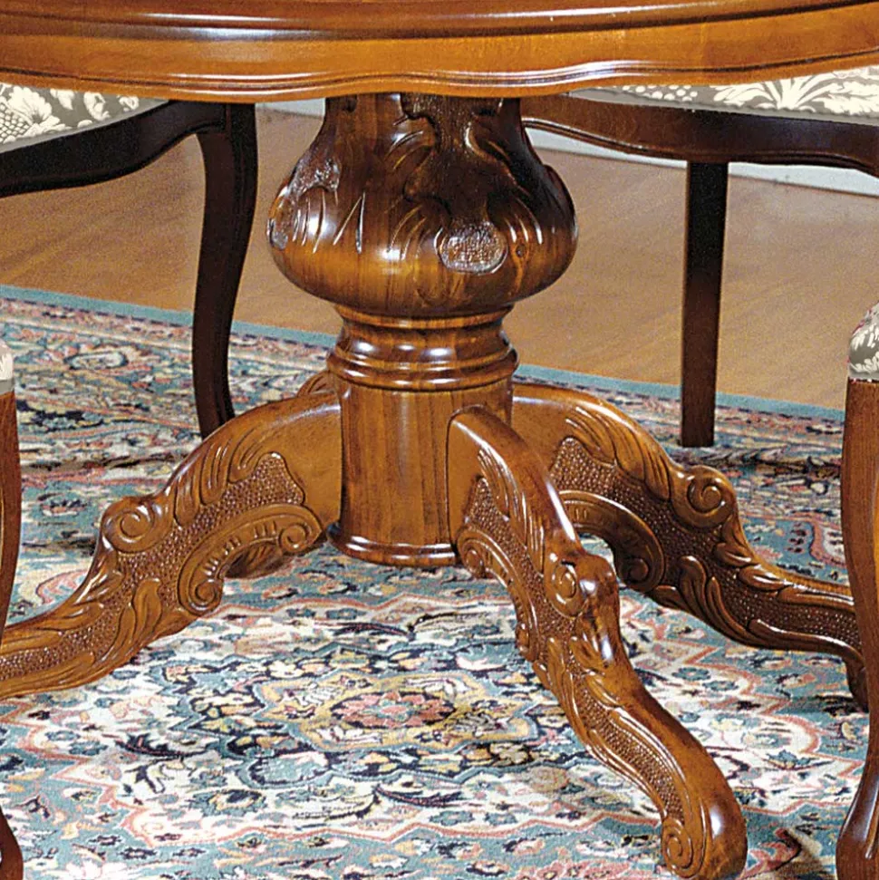 Besonderes Highlight bildet das üppige, kunstvoll gearbeitete Säulengestell. Die geschwungene Form erinnert an klassische Barock-Architektur und trägt die runde Platte mit majestätischer Eleganz. Diese zentrale Säule schafft zudem Beinfreiheit und eine offene, kommunikative Sitzatmosphäre – perfekt für gemeinsame Mahlzeiten und Gespräche.