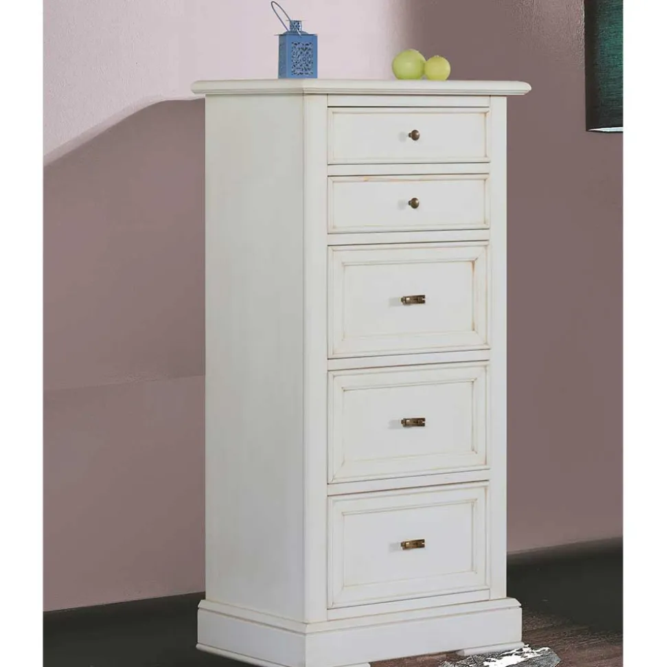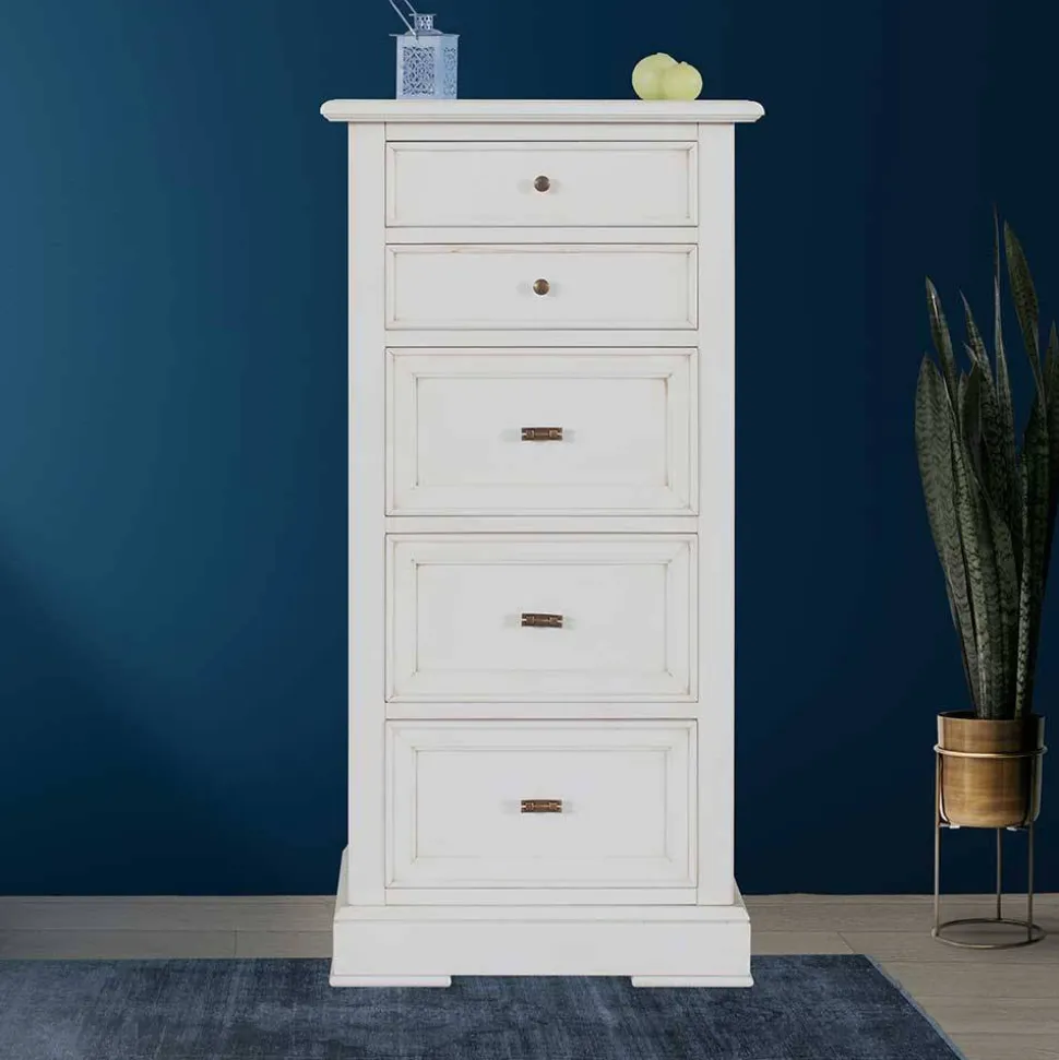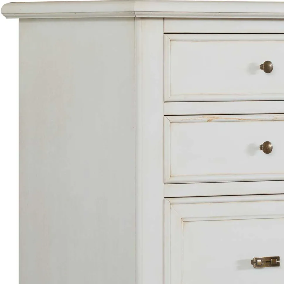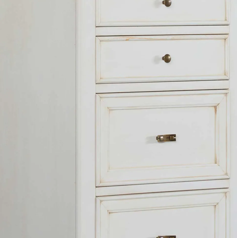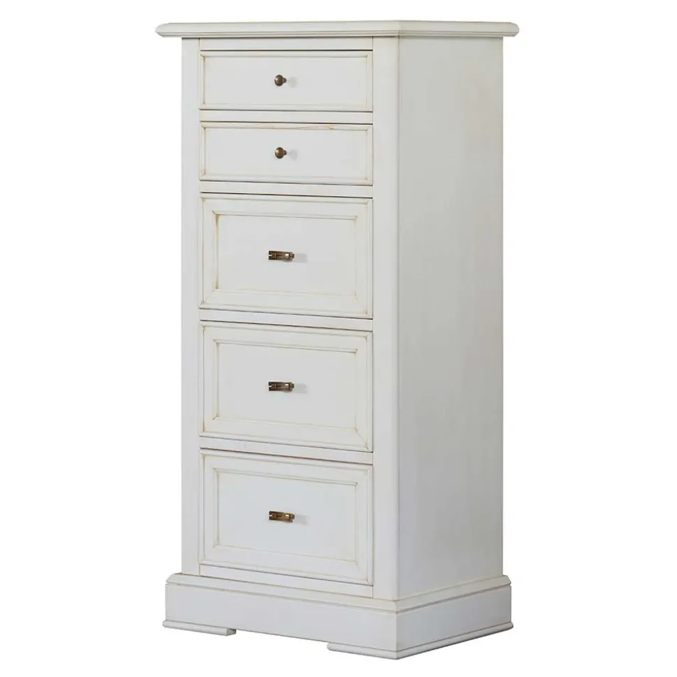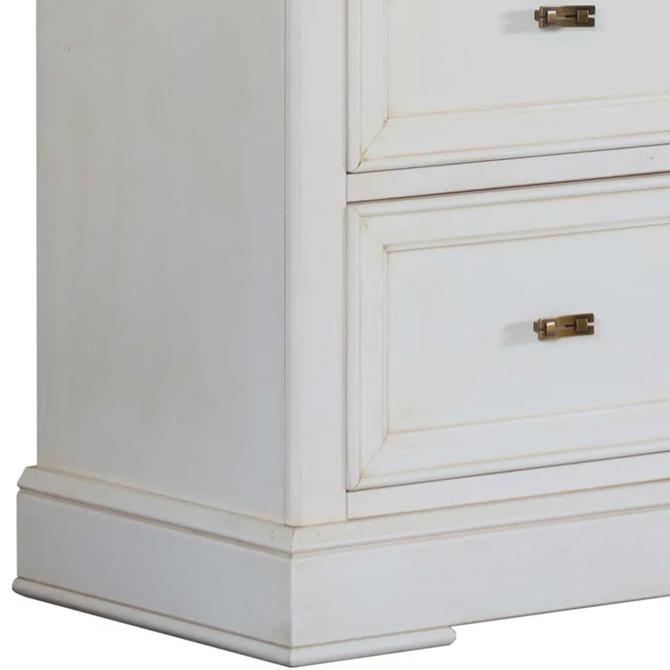 Mit ihrer stilvollen Farbgebung in Antikweiß ist die Kommode „Annot“ ein echter Blickfang und bringt eine charmante Vintage-Note in Ihre Räume. Das Antikweiß wurde speziell aufgetragen und in einem Antik-Finish veredelt, wodurch eine dezente Patina entsteht, die den nostalgischen Charakter des Möbelstücks unterstreicht. Messingfarbene Metallgriffe ergänzen die Optik und runden das edle Gesamtbild stilvoll ab.