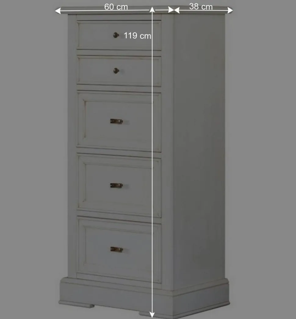 Mit einer Breite von 60 cm, einer Höhe von 119 cm und einer Tiefe von 38 cm bietet die Kommode „Annot“ eine praktische Größe, die sich auch in kleineren Räumen gut einfügt. Fünf geräumige Schubladen mit stabilen Holzauszügen bieten viel Stauraum, sodass Sie sowohl kleinere Gegenstände als auch größere Accessoires bequem unterbringen können. Die beiden oberen Schubladen (Innenmaße ca. 40 x 9 x 30 cm) eignen sich hervorragend für kleinere Utensilien, während die drei größeren Schubladen (Innenmaße ca. 40 x 19 x 30 cm) Platz für voluminösere Dinge bieten. Die stabilen Holzauszüge gewährleisten eine zuverlässige Funktionalität und machen das Öffnen und Schließen der Schubladen zum Kinderspiel.