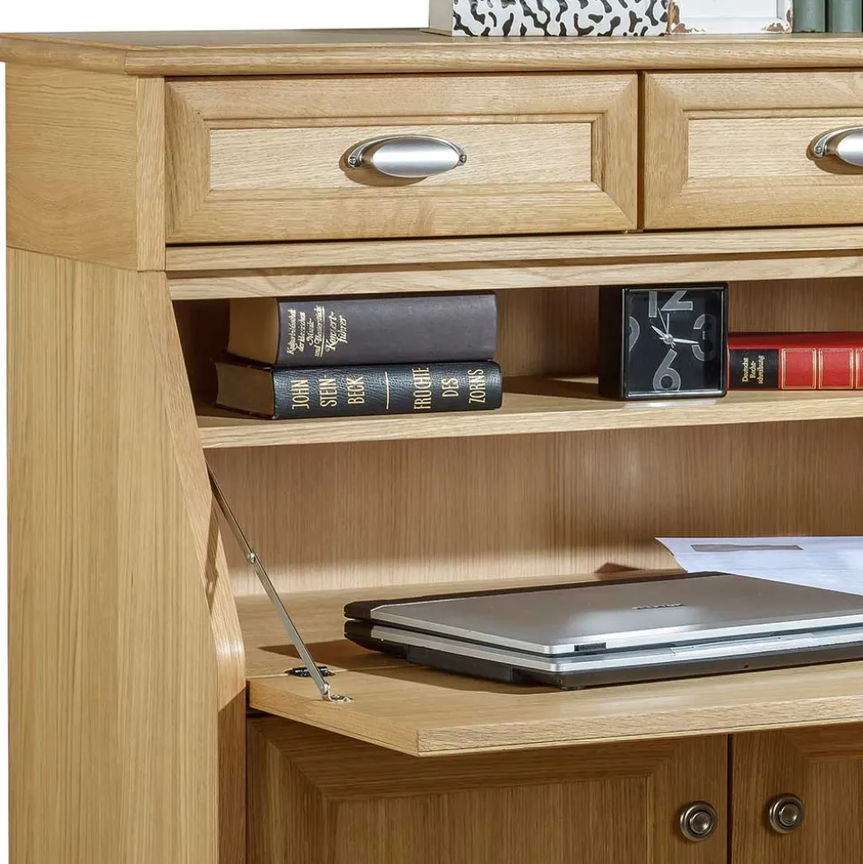 Das klassisch zeitlose Design des „Optica“ strahlt Harmonie und Eleganz aus und fügt sich nahtlos in jede Raumgestaltung ein. Die Fronten des Sekretärs sind mit hochwertigen Rahmenaufdopplungen aus massivem Eichenholz verziert, die die Qualität des Möbelstücks unterstreichen. Besondere Akzente setzen die dekorativ quer verlaufende Holzmaserung sowie die handlichen Muschel- und Knopfgriffe aus Metall, die nicht nur schön aussehen, sondern auch eine hohe Funktionalität bieten.